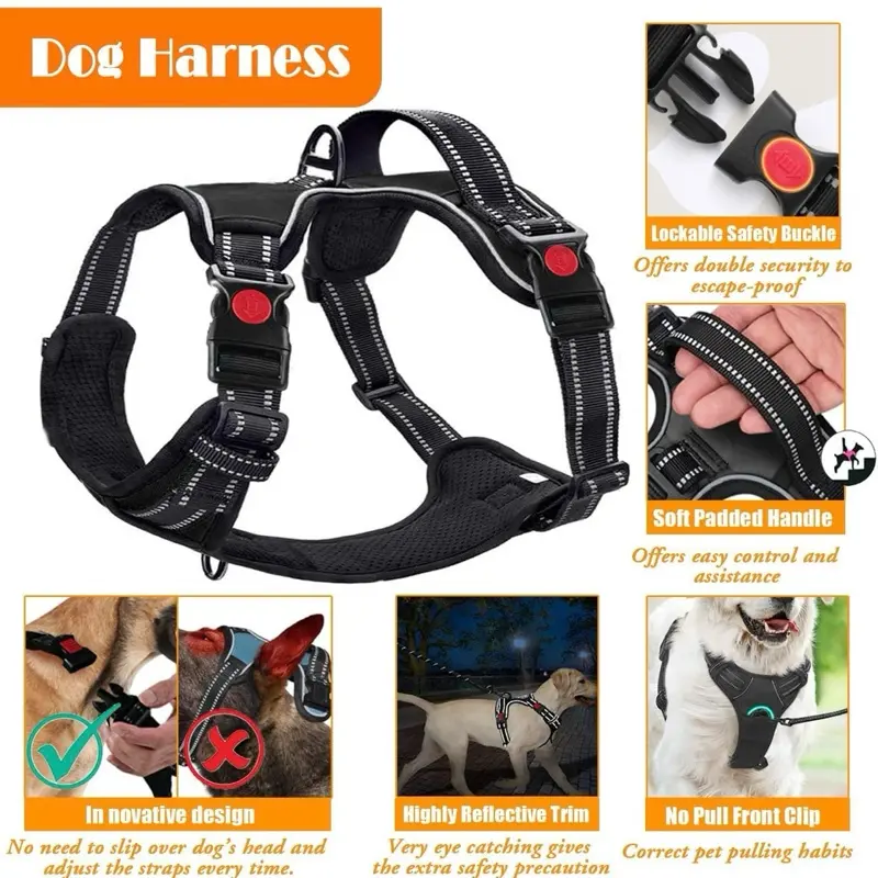 Ergonomic No-Pull Harness Design: Say goodbye to tugging and discomfort! Our harness, crafted with an ergonomic no-pull design, alleviates neck pressure and enhances comfort. The reflective stitching on the harness and collar ensures visibility and safety on those early morning or late-night outings.