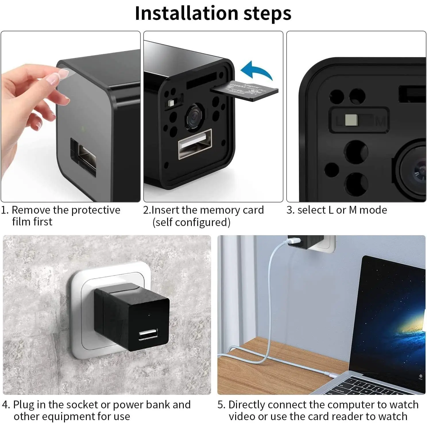 【Smart Camera 】 This is an upgraded 2-in-1 smart charger, which can meet your charging or shooting needs. Not only can it charge your portable devices ( Android/ iOS ), but also can record continuous video at the same time for safety.
