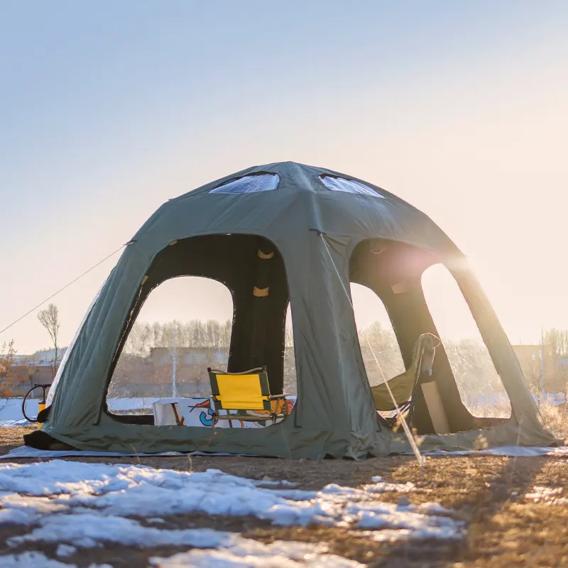 This inflatable tent adopts high-temperature heat sealing seamless splicing technology and features an integrated built-in inflatable pole design. It is equipped with a manual inflation pump with its own pressure limiting valve to better ensure your safety. The included cables and steel piles enable the 4-season tent to be better secured to the ground. You only need to spend a little time setting up a luxurious tent, making your camping trip easier