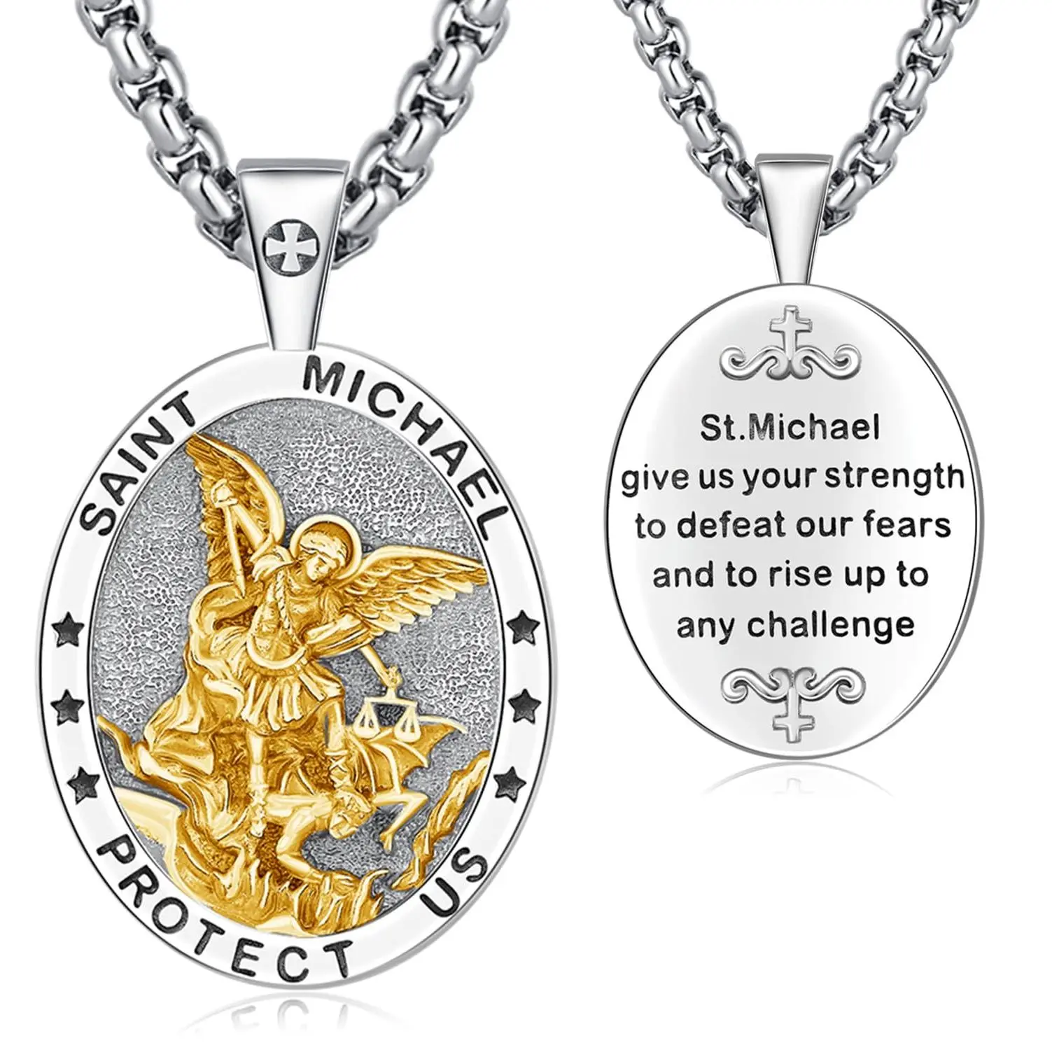Saint Michael the warrior who combats evil. He is the protector and leader of the heavenly army, mentioned in the Bible, especially in the Book of Revelation, where he leads the angels in a battle against Satan. Saint Michael is venerated across various Christian denominations as a symbol of strength, courage, and divine protection.