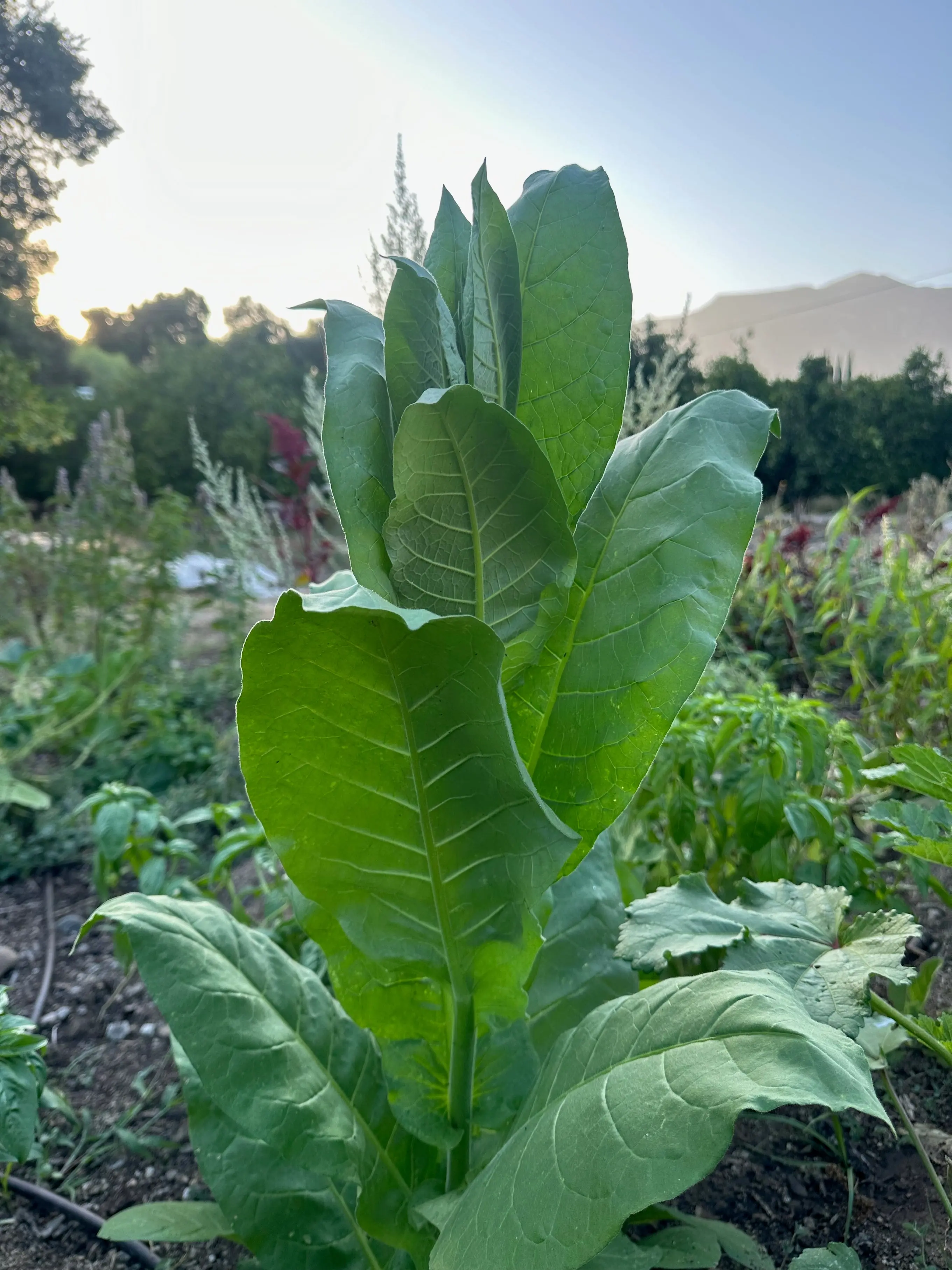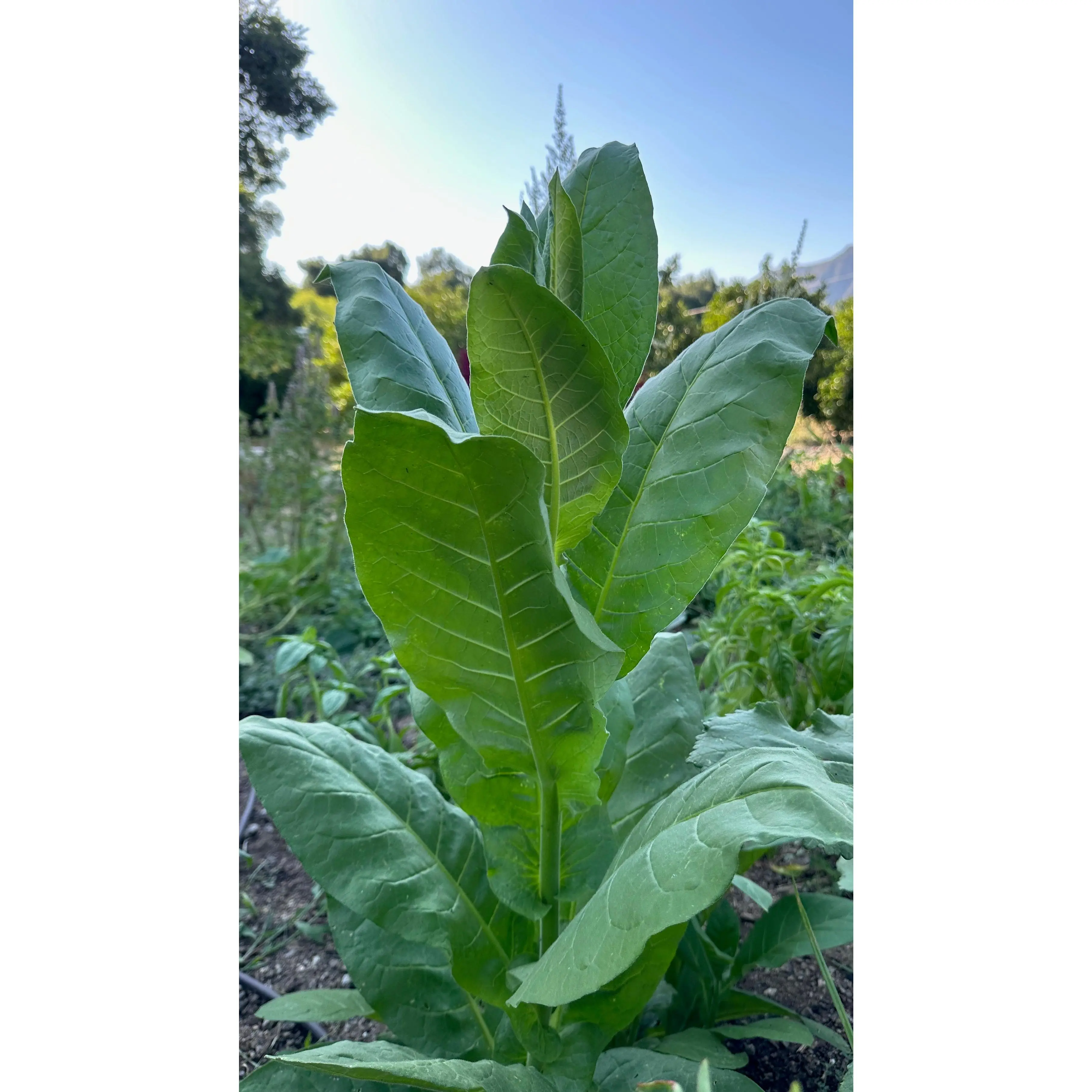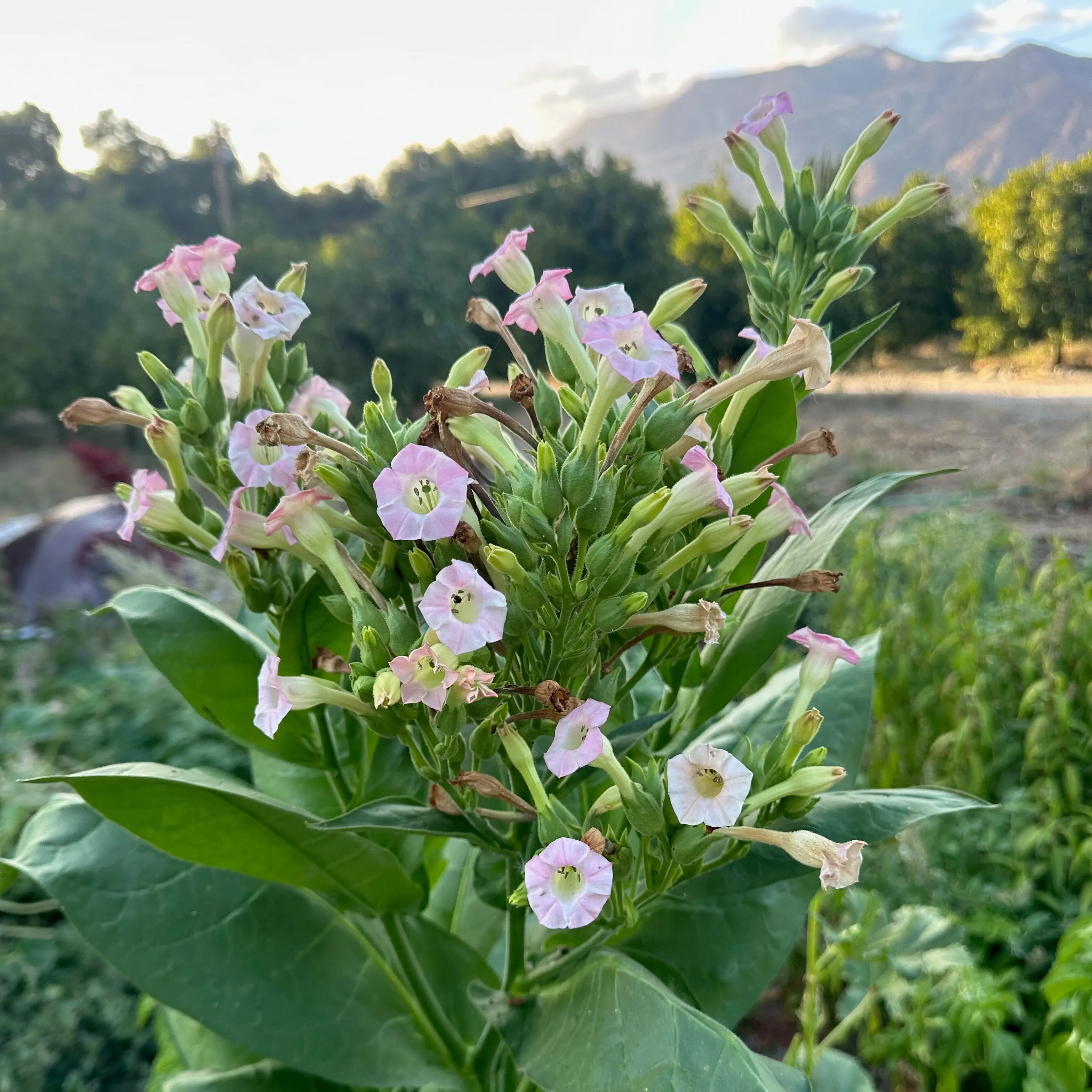 Shirazi Tobacco (Nicotiana tobaccum) originally hailed from the Shiraz region of Persia and we’re excited to offer our own certified organic version of this variety. This is a coveted strain of tobacco that is fast growing (more so than many other Tobaccum species) that produces thin leaves and has a distinctive cone shaped apical bud. Leaves appropriately cured will turn to a gorgeous light tan. All varieties of Nicotiana tobaccum make beautiful ornamentals namely due to their pronounced trumpet-shaped flowers.