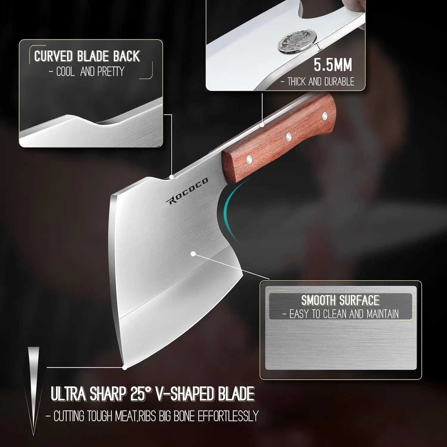 The 25° V-shaped blade edge reduces cutting resistance, enabling effortless and precise bone chopping without chipping. Its smooth, rust-resistant surface ensures easy cleaning and maintenance, ideal for heavy-duty tasks like slicing ribs or frozen foods.