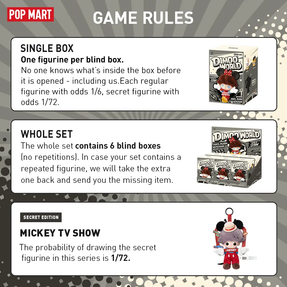 ·Blind Box: All items are figurine products with different designs. Each box contains one random design for value of 50.99 USD, and comes in a sealed box with no one knows what's inside-including us. This whole collection contains 6 regular figurine products (Odds: 1/6), and 1 secret edition(Odds:1/72).