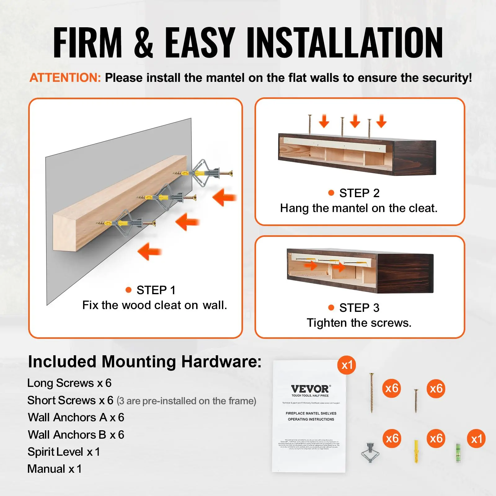 • Easy to Install: For secure and straightforward installation, please ensure the wood mantel is mounted on flat walls. All necessary mounting hardware is included, making the assembly process quick and hassle-free.