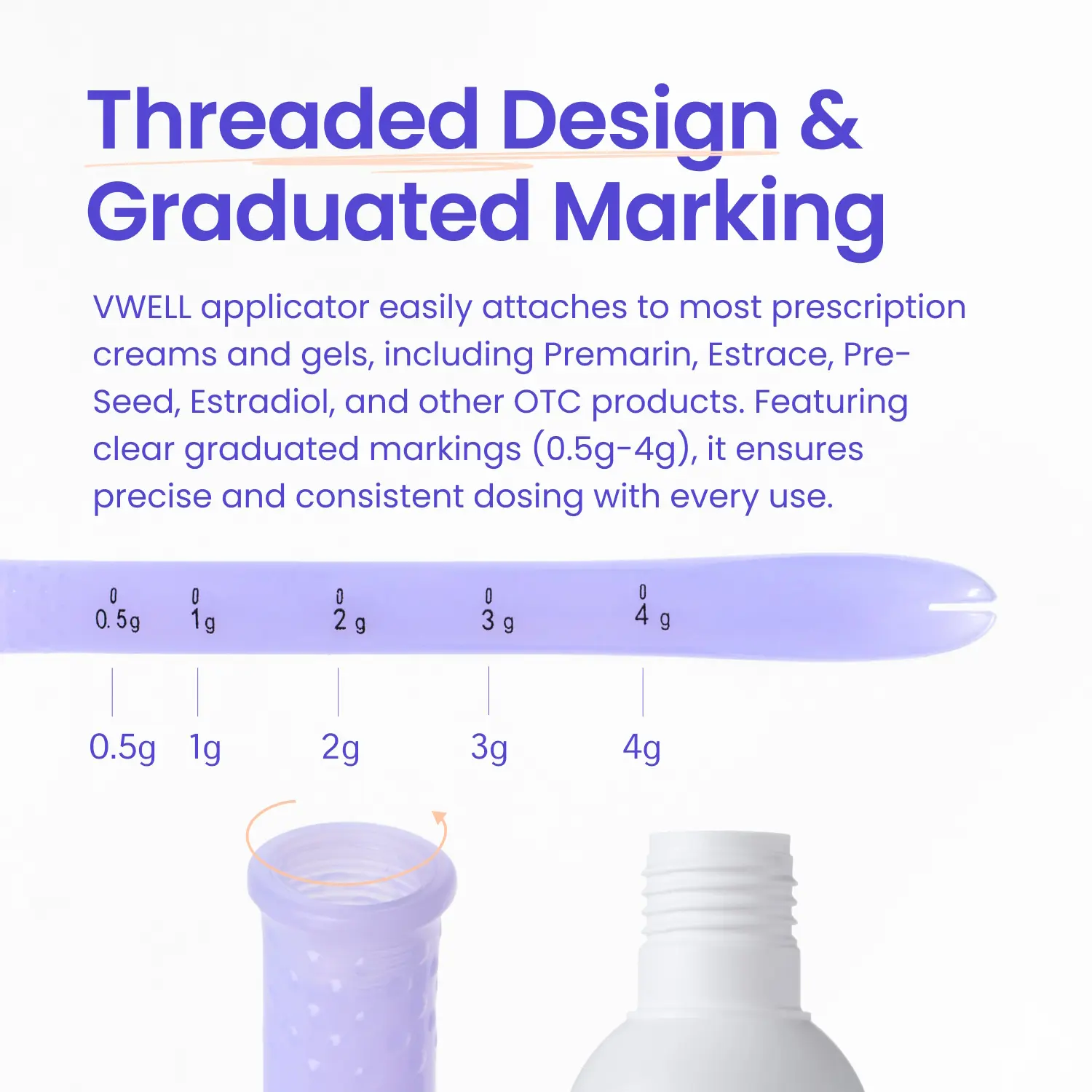 ·Threaded End with Measurement Marking - Designed to fit most over-the-counter and prescription threaded tubes, creams, and gels such as Premarin, Estrace, Preseed, Estradiol, and many more.