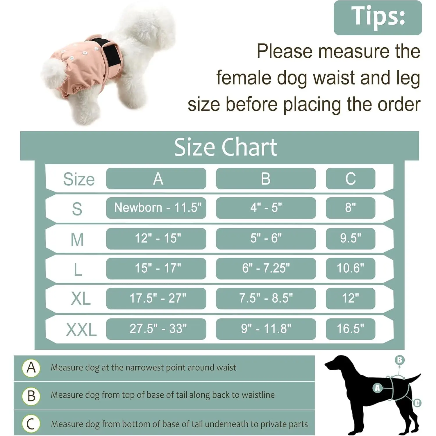 Durable Female Diapers: Female diapers are in 4 sizes- sizes S all the way to XL. Please measure your with measurement tape for correct size before ordering. Each package included 5 cute diaper cloth. Adjustable snaps make sure you will get a fit size that won't slip