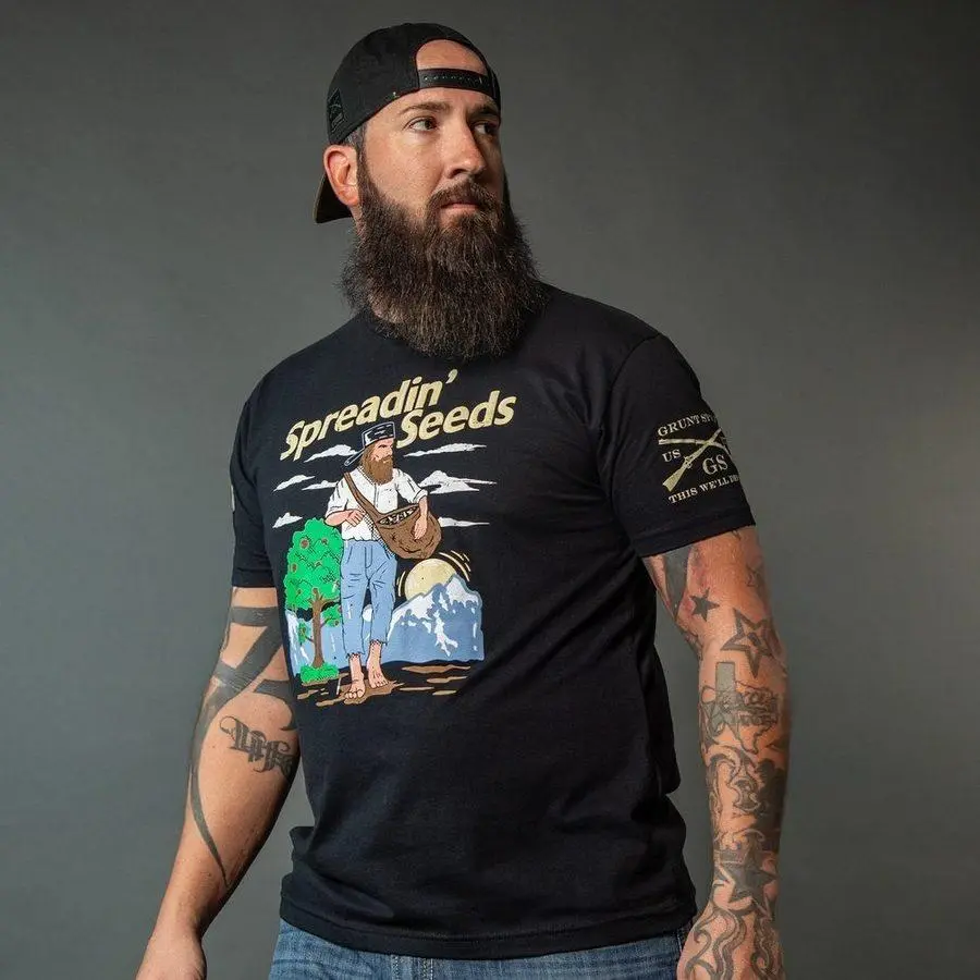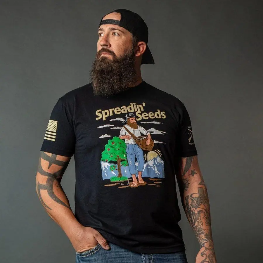 Our Supply Chief wants the room, so these have to go! We have only limited sizes and quantities available.The Spreadin’ Seeds T-Shirt in Black is for those who know that liberty isn’t just a concept—it’s something you plant, nurture, and watch grow. Loud, proud, patriotic, and ready for action—just like you. This Grunt Style twist to a classic, Johnny Appleseed, is a popular figure in American folklore, a tall tale character embodying a wanderer who planted apple orchards across the frontier. Our Grunt Style Shirts are crafted with the following details: