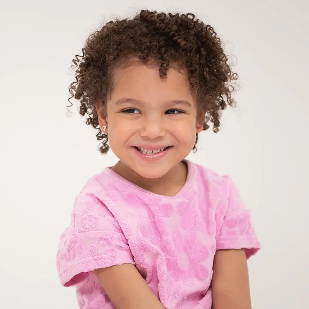 Fill your little girls heart with joy with this pair of small heart and flower stud earrings. This is an exclusive design, the silver heart is adorned with 5 pink cubic zirconias that form a gorgeous flower. Finely crafted entirely in 925 sterling silver and cubic zirconia stones, they are hypoallergenic and safe for children with sensitive ears.They feature a threaded earring post and back to ensure your child's earrings stay safely and comfortably in place. A complimentary gift box is included.