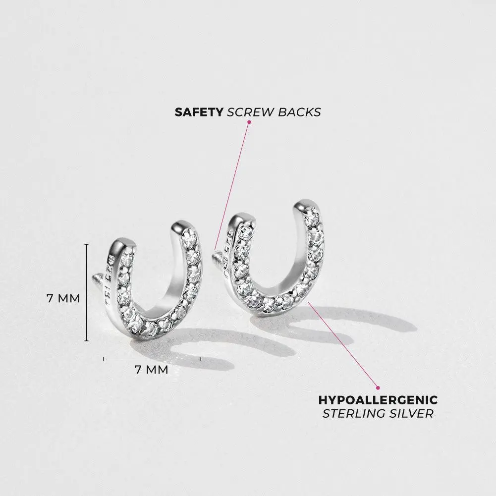 These lucky horseshoe safety screw back earrings are stunning and perfect for your little animal lovers. Its sparkling cz stones and petite size make these 925 sterling silver horseshoe earrings perfect for toddlers and young girls with sensitive ears. These horseshoe earrings for kids bring good luck for all occasions and are sure to add a hint of glam to her look and her jewelry box. This pair of sterling silver earrings come with safety screw backs which are perfect for little girls on the go! Gift box included.