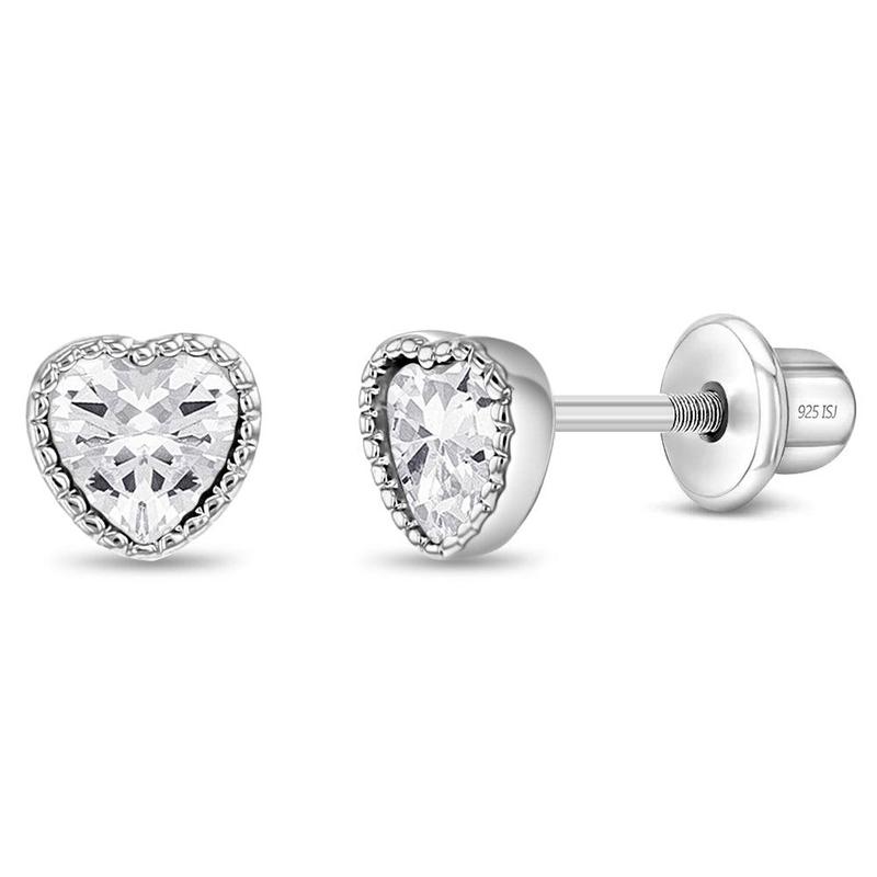 These adorable heart-shaped earrings are a lovely accessory for little girls. Featuring a bold, heart shaped cubic zirconia stone at the center, they sparkle with vibrant charm. Crafted from hypoallergenic 925 sterling silver, these earrings are ideal for girls with sensitive skin, ensuring both comfort and safety. The design is completed with a secure screw-back closure, providing extra peace of mind for parents. Gift box included.