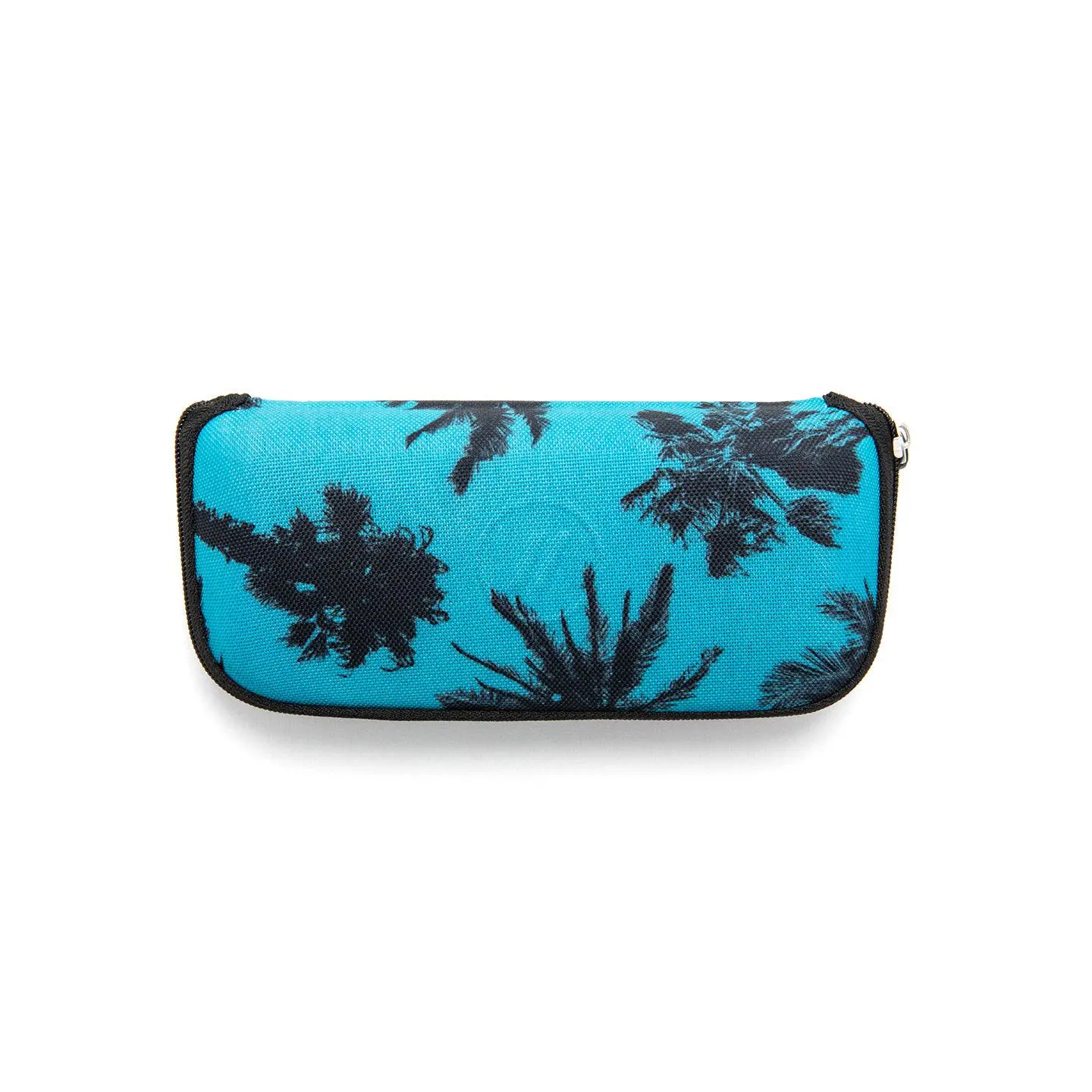 The Pacific Case from Blenders Eyewear is designed to keep your sunglasses or eyeglasses safe and stylish. Featuring a vibrant blue exterior with black palm tree graphics, this case adds a tropical flair to your accessories. Crafted with a lightweight yet durable EVA foam rubber exterior, it offers hard-shell protection while maintaining a soft touch. Finished with Oxford fabric and a rubber zipper pull tab featuring the Life in Forward Motion logo, it combines functionality with a sleek aesthetic.