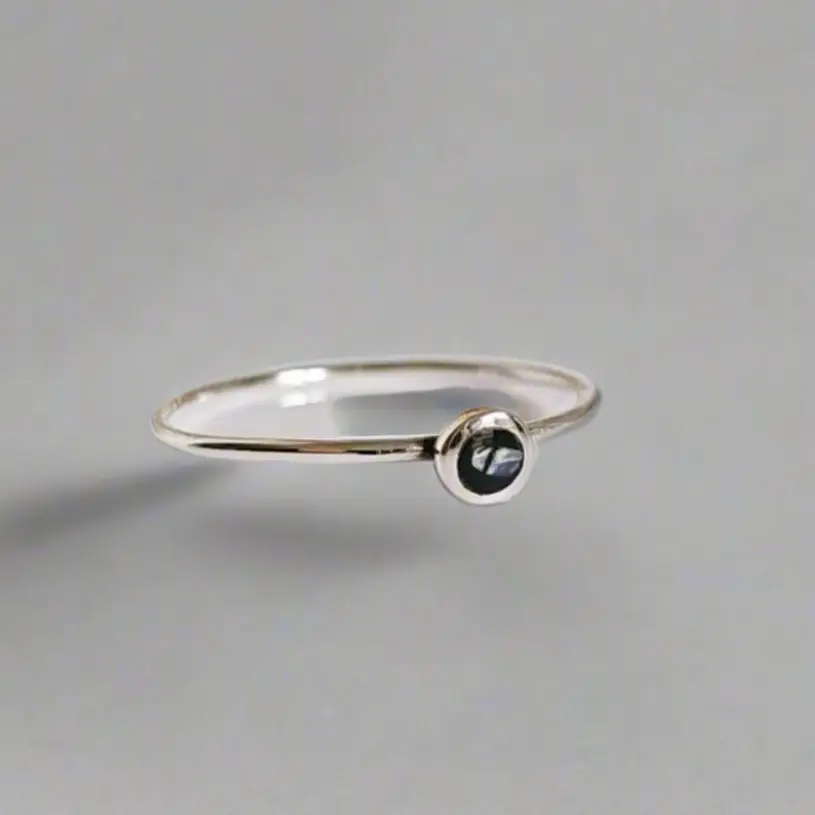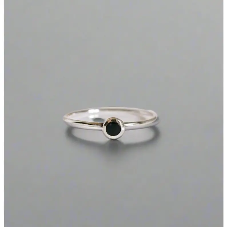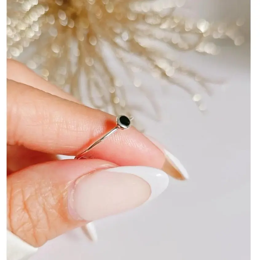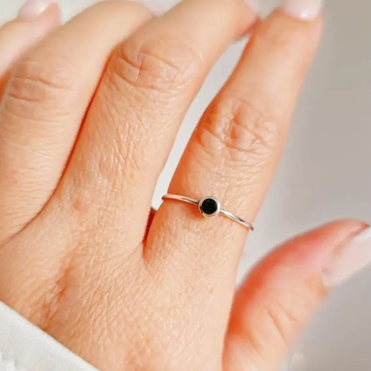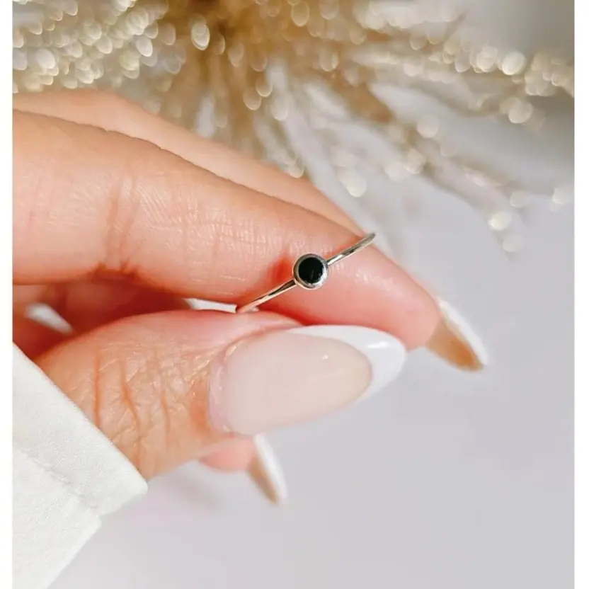 This Dainty Black Onyx Ring offers a sleek, minimalist design, perfect for daily wear or stacking. The round black onyx stone, set in a high-polish 925 sterling silver band, exudes sophistication. Ideal for those who appreciate subtle beauty, it features a 2.8 mm center stone, a 4.1 mm top height, and a 0.9 mm band width. The high polish finish enhances its elegant appearance.