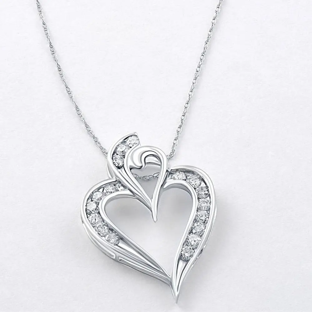 10K White Gold 1/2Ct TW Real Diamond Heart Pendant Necklace 1" Tall
