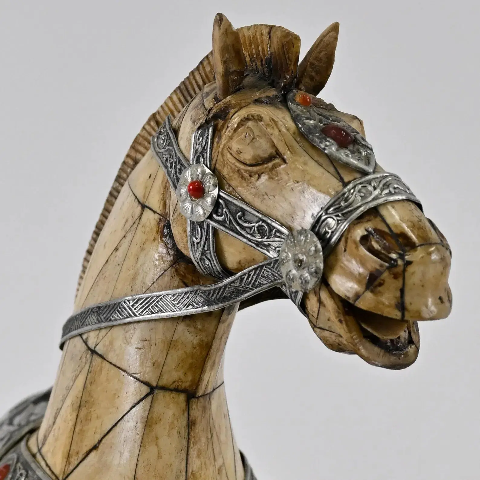 Chinese Bone Horse Sculpture | Flora and Gemstone-InlaidSaddle | Handcrafted Tessellated Design | Decorative Art Collectible | Unique
