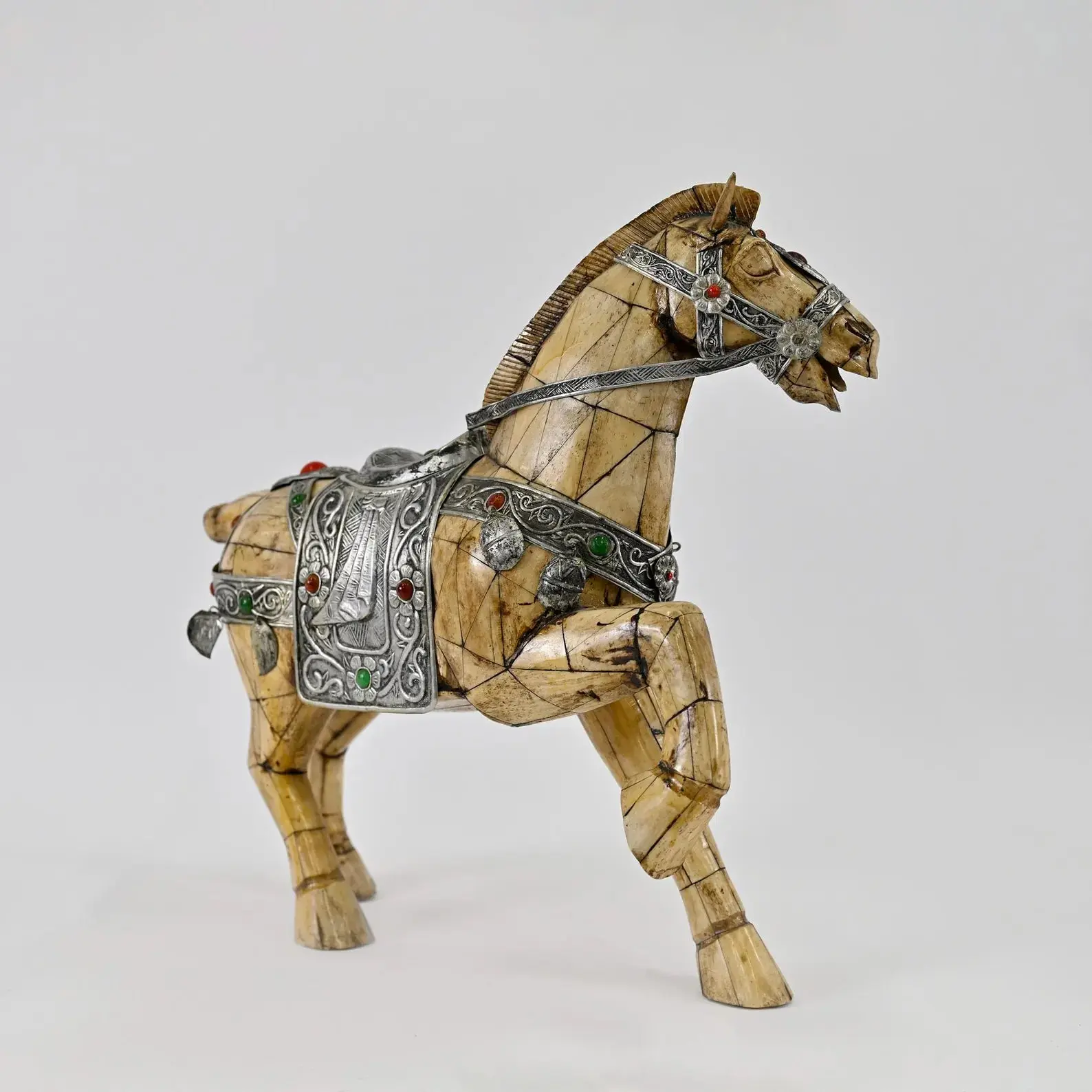Celebrate exquisite craftsmanship with this Chinese bone horse sculpture, featuring a delicately inlaid saddle adorned with floral motifs and gemstones. Each piece is handcrafted with a unique tessellated pattern, making it a striking decorative art collectible. Perfect for adding a touch of cultural elegance and artistry to any space.