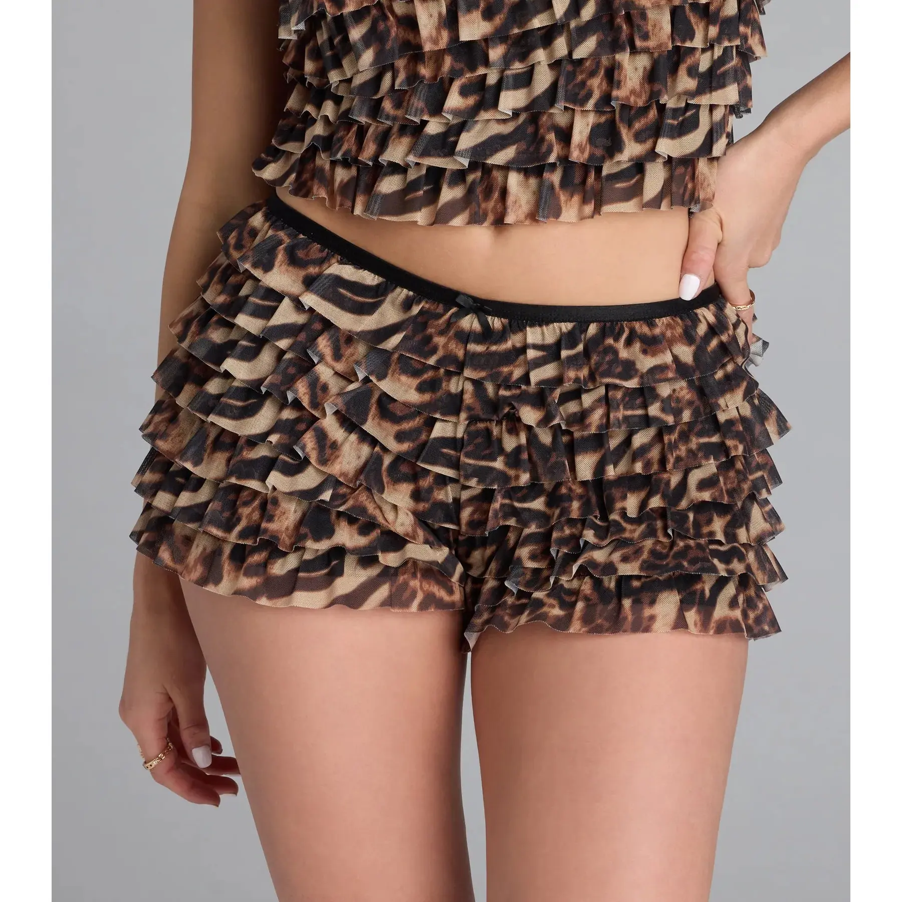 Shake it up in this leopard ruffle hot short for a night on the prowl!