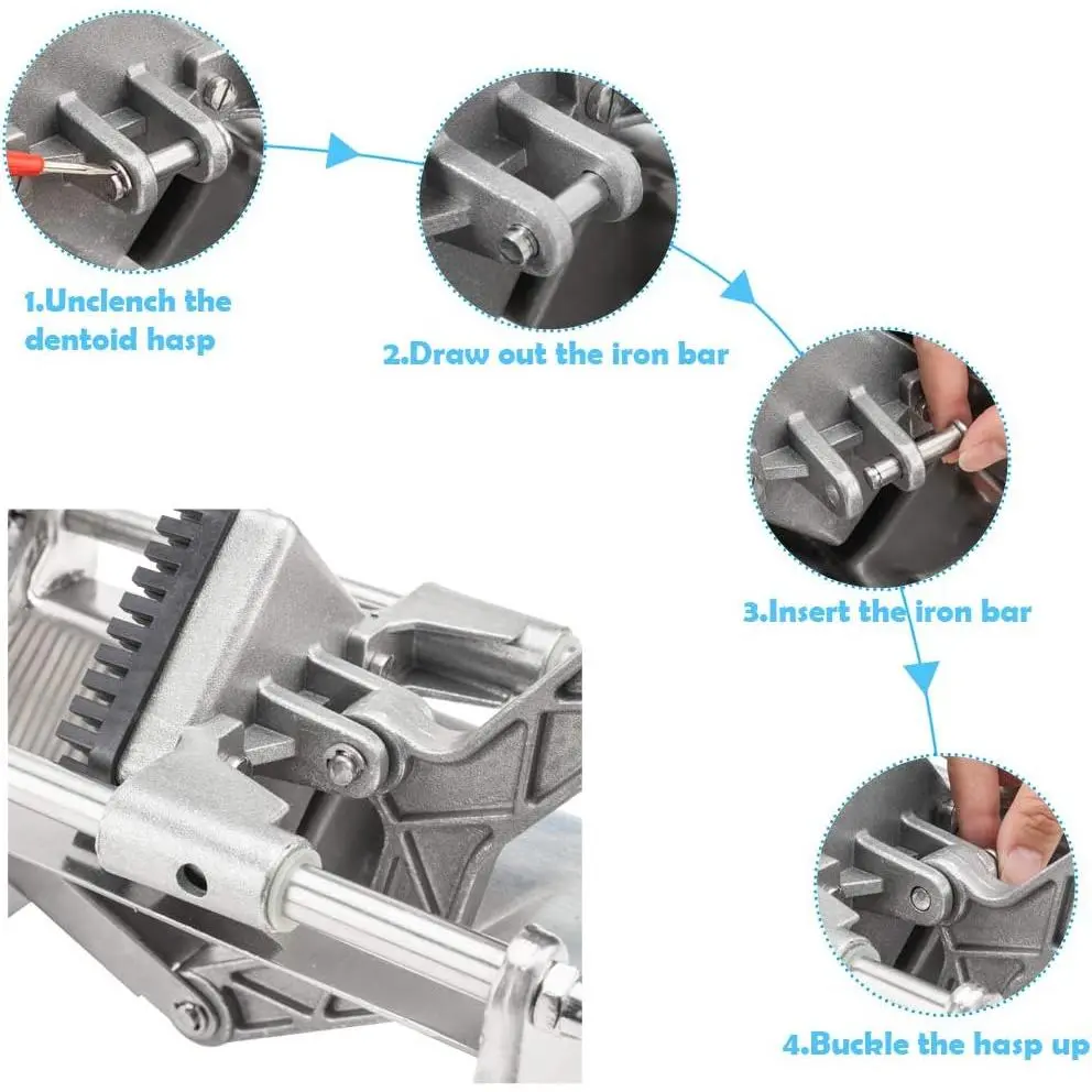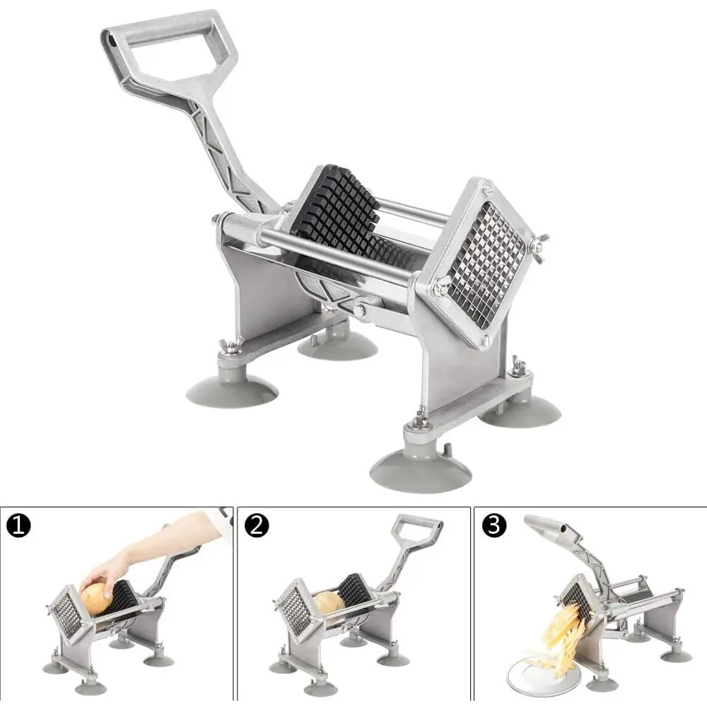 foodgrade u anticorrosion materialmade of advanced cast aluminum alloy frame and rustproof 304 stainless steel blades the vegetable chopper is durable and corrosionproof which also ensures food security and safeguard your health high efficiencyu durability heavy duty cast iron body and ergonomic designed handle provide this potato chopper with high efficiency and durability x 807 x 945 l x w x h four sizes blades there are 4 sizes of blades to choose12inch38inch14inch blades and pusher blocks u 8wedge blade pusher kit it can meet your various cutting need in daily lifenot only for potatoes but also for vegetables and fruits you can dice carrots and cucumbers etc sturdy legs you can mount the potato cutter to your countertop without drilling this suction feet design makes this cutter grasp the table surface strongly sturdy legs provide more stability while mounting the cutter on any flat surface safe u practical you breeze through cutting potato chips by using this fruit vegetable slicer without worry about hurting