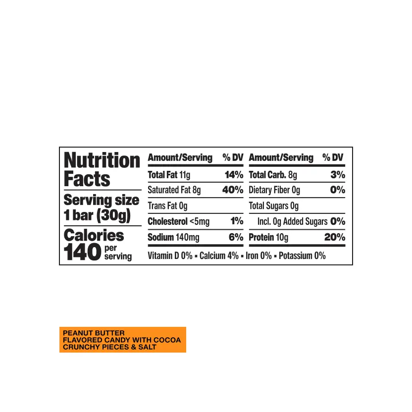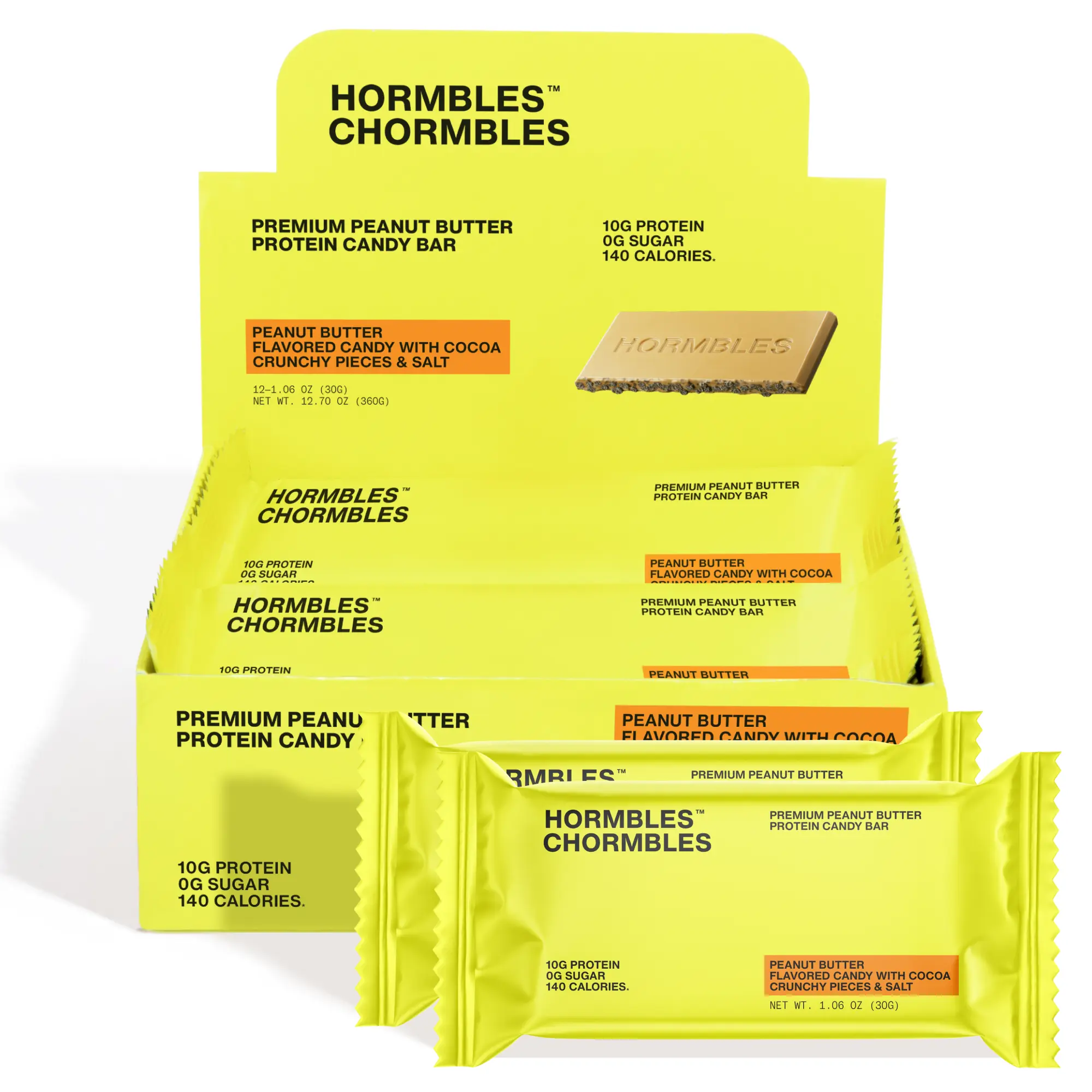 Hormbles Chormbles Peanut Butter Protein Candy Bars have 10g Protein, 0g Sugar and 140 Calories. Creamy, peanut butter flavor that is filled with cocoa crunch for extra indulgence.