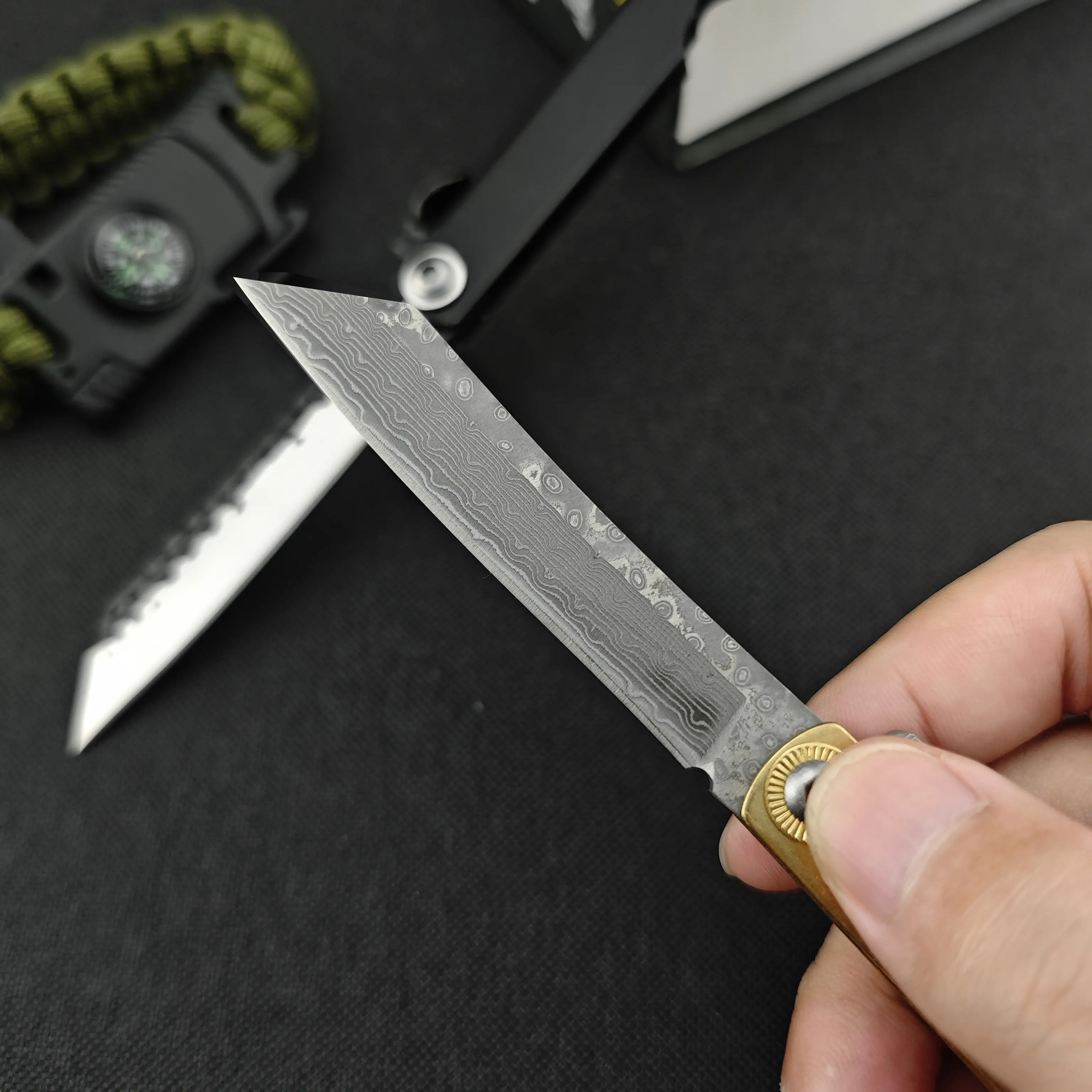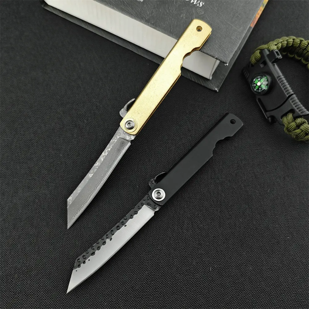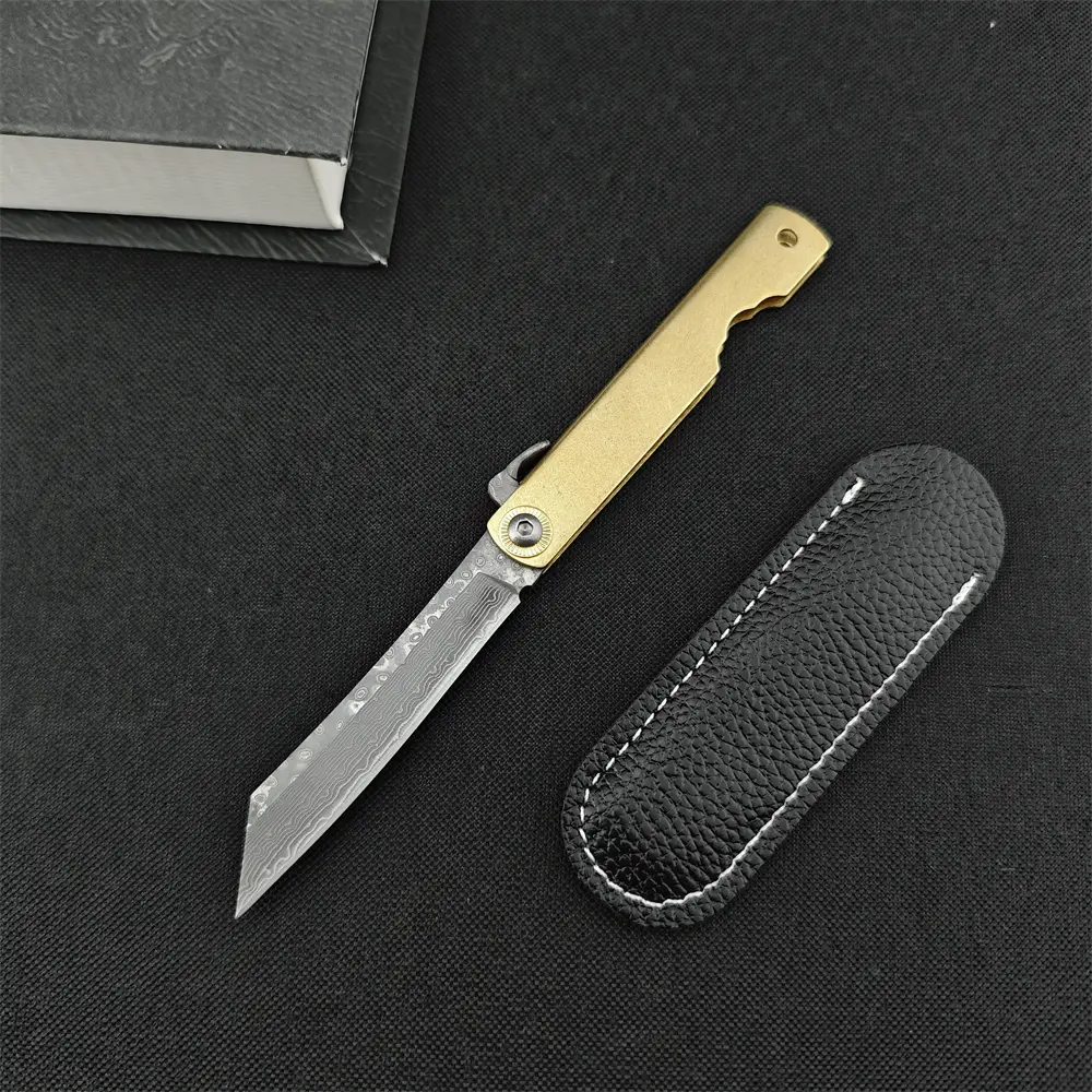 Pocket Folding Knife Damascus Steel Blade Multi-purpose Tools Outdoor Camping Knives with PU Leather Sheath