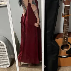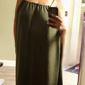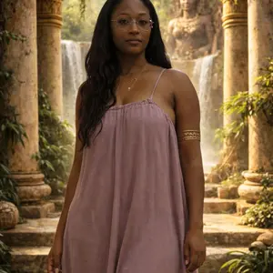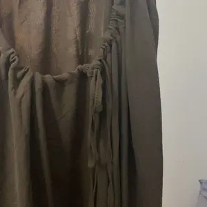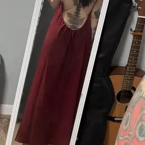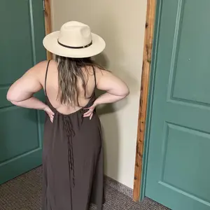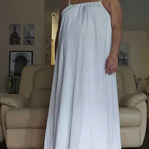 Great linen fabric. Feels like free people. Very comfortable You could almost even sleep in it or go shopping. The back is adjustable so it can be raised to be more modest.