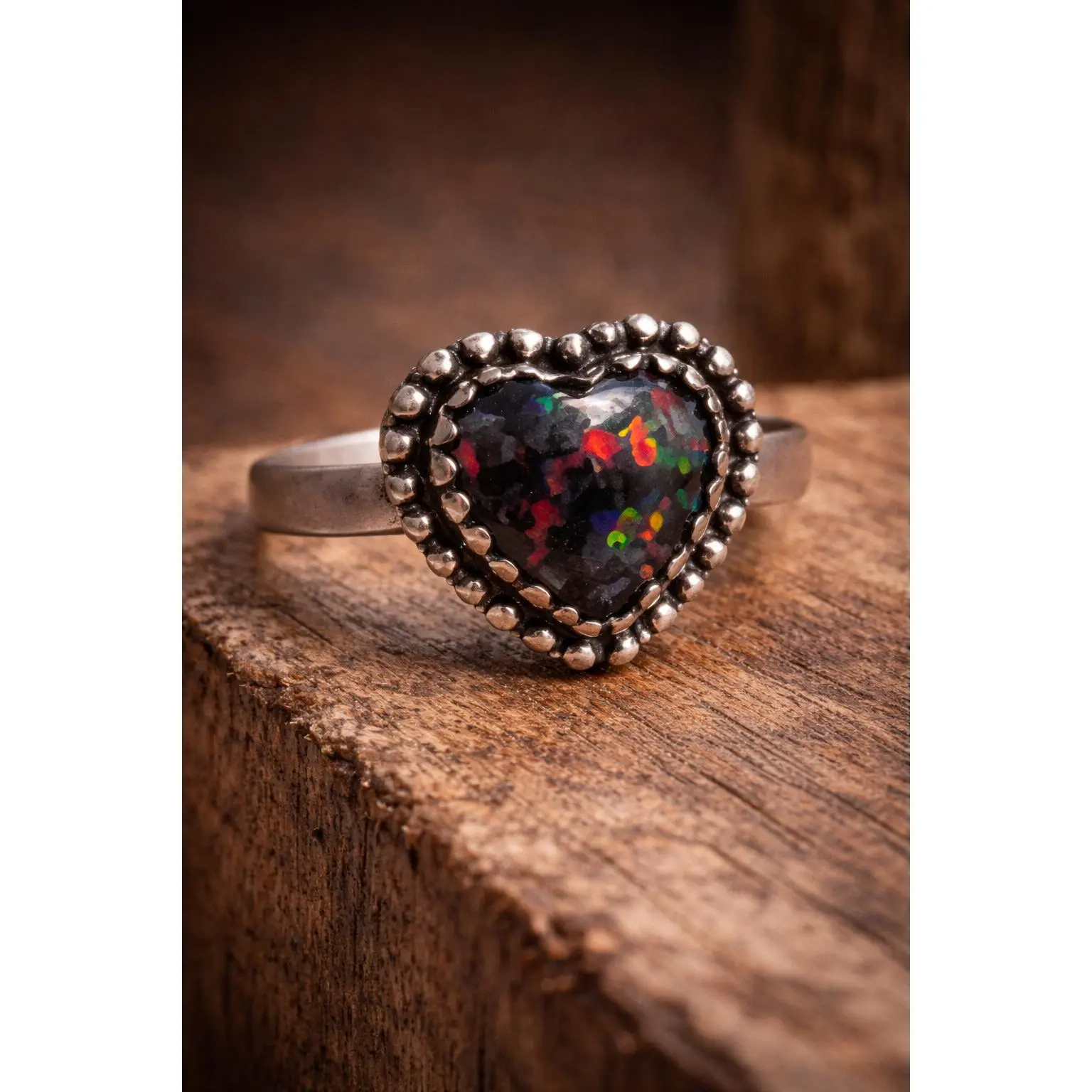 The Opal Heart Ring is a dreamy statement of love and individuality. Crafted in 925 stamped sterling silver, it features a romantic heart-shaped design. The ring pairs the rich, iridescent shimmer of black opal with the soft glow of pink opal. This striking contrast catches the light from every angle. Bold yet feminine, it's perfect for stacking or wearing solo.