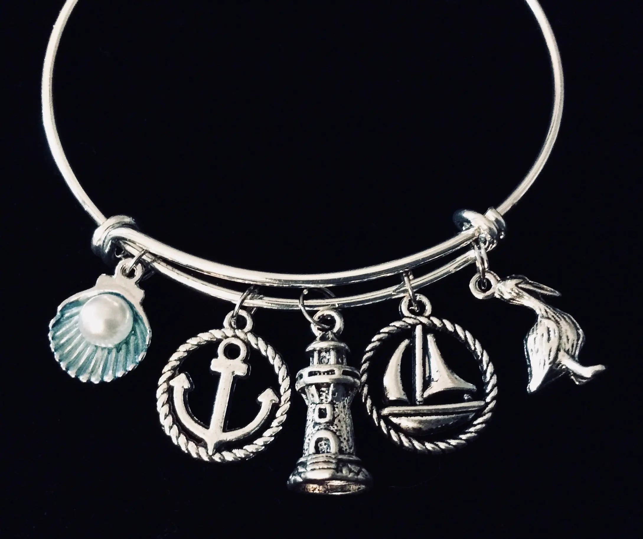 Nautical Charm Bracelet Expandable Adjustable Silver Bangle One Size Fits All Gift Pelican Lighthouse Sailboat Anchor Seashell Pearl