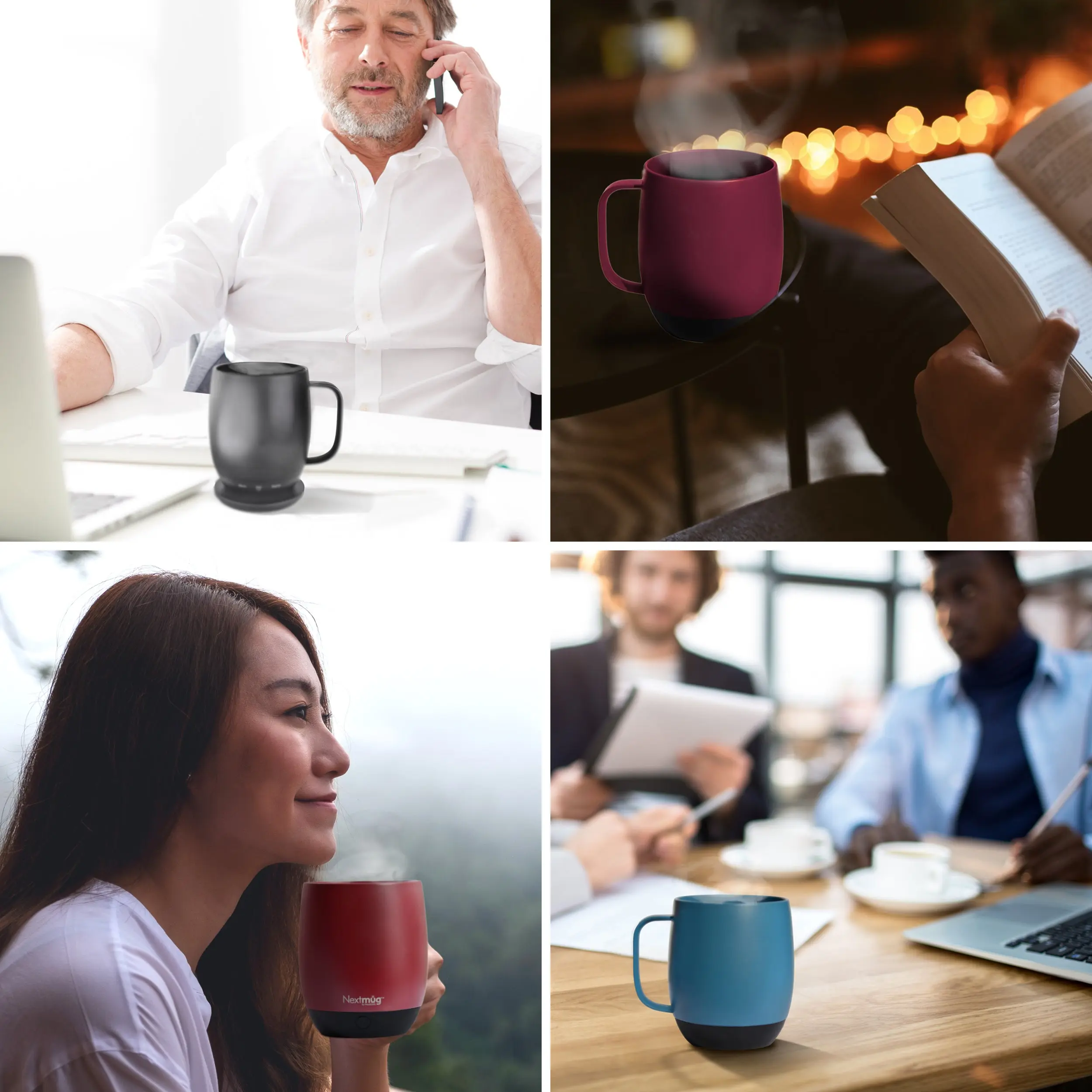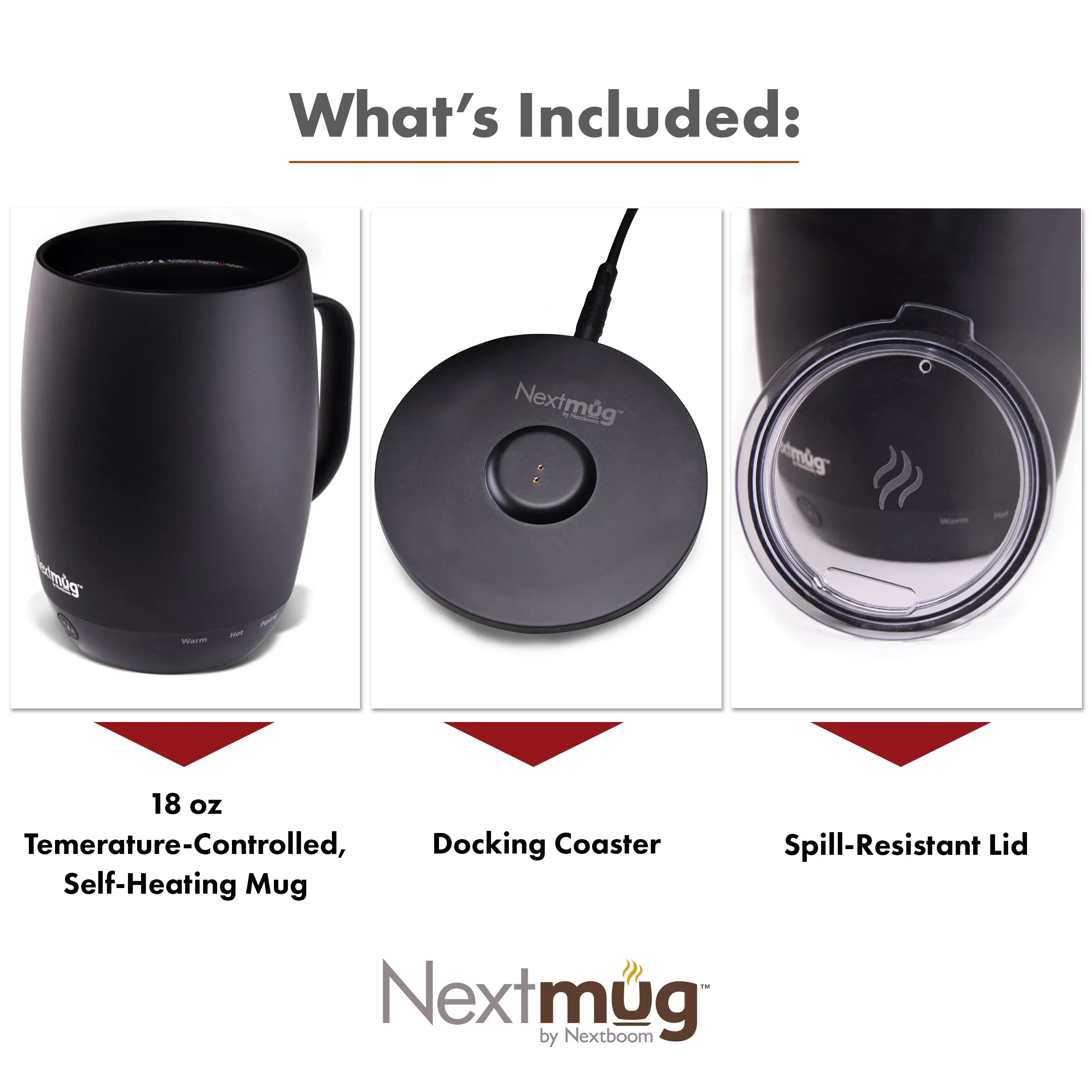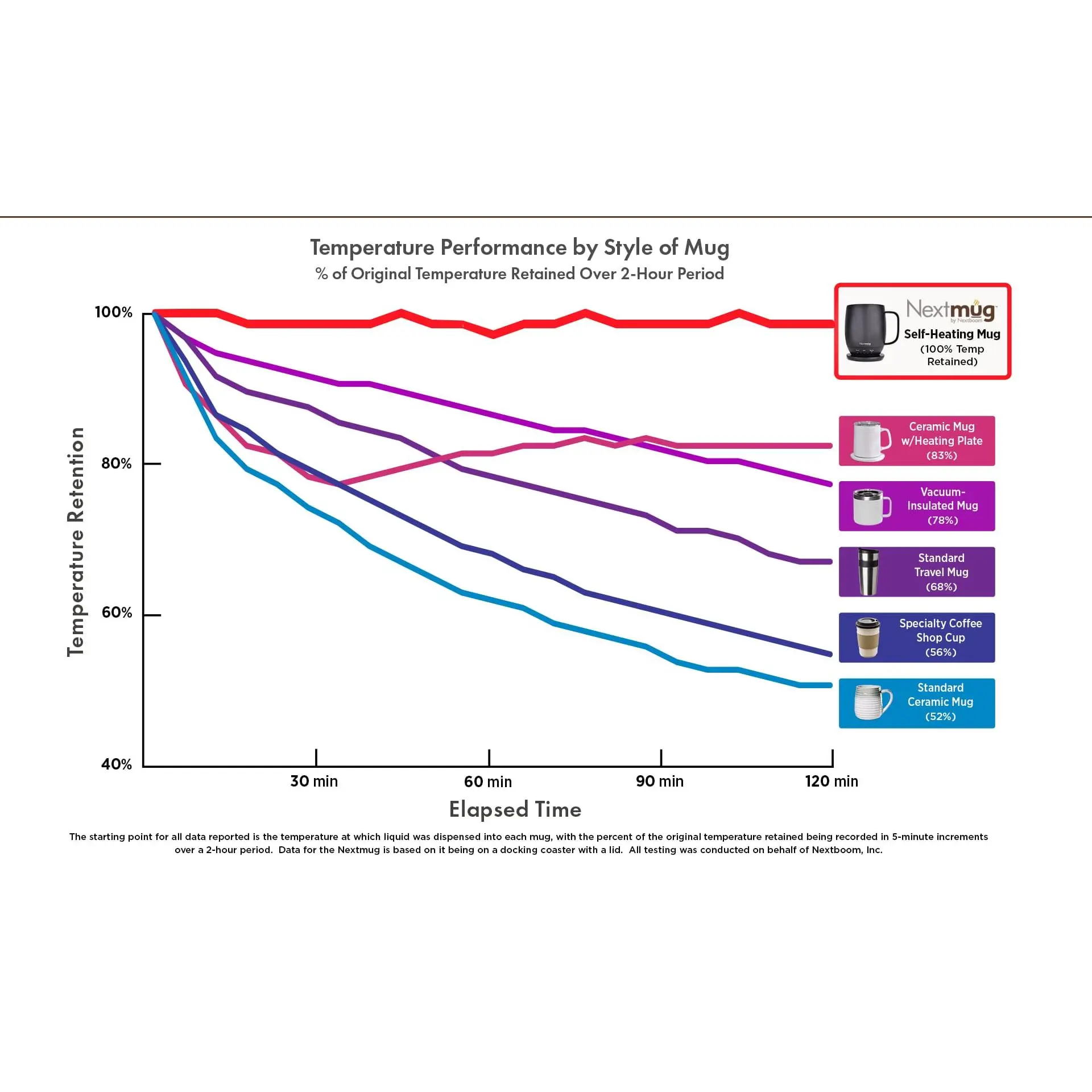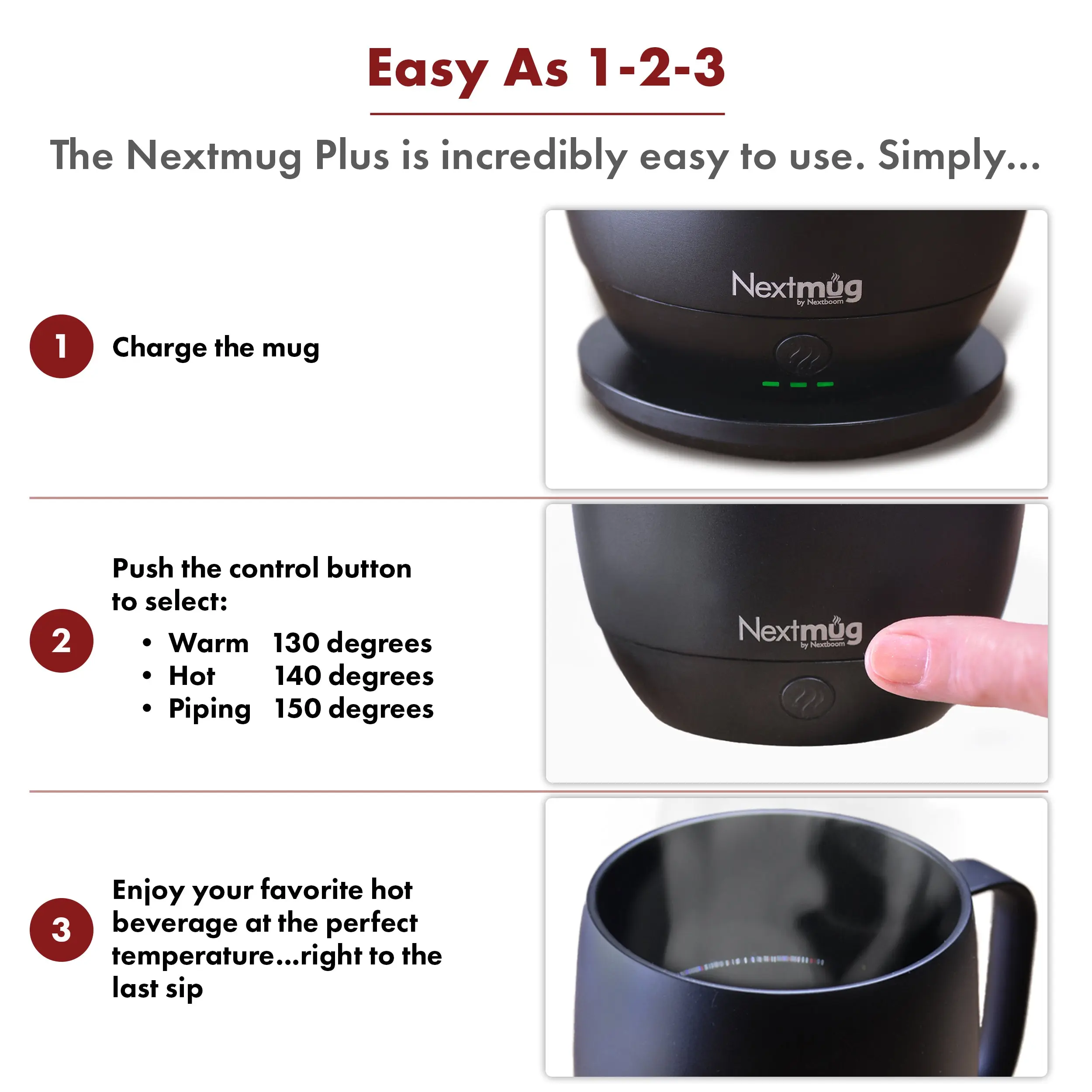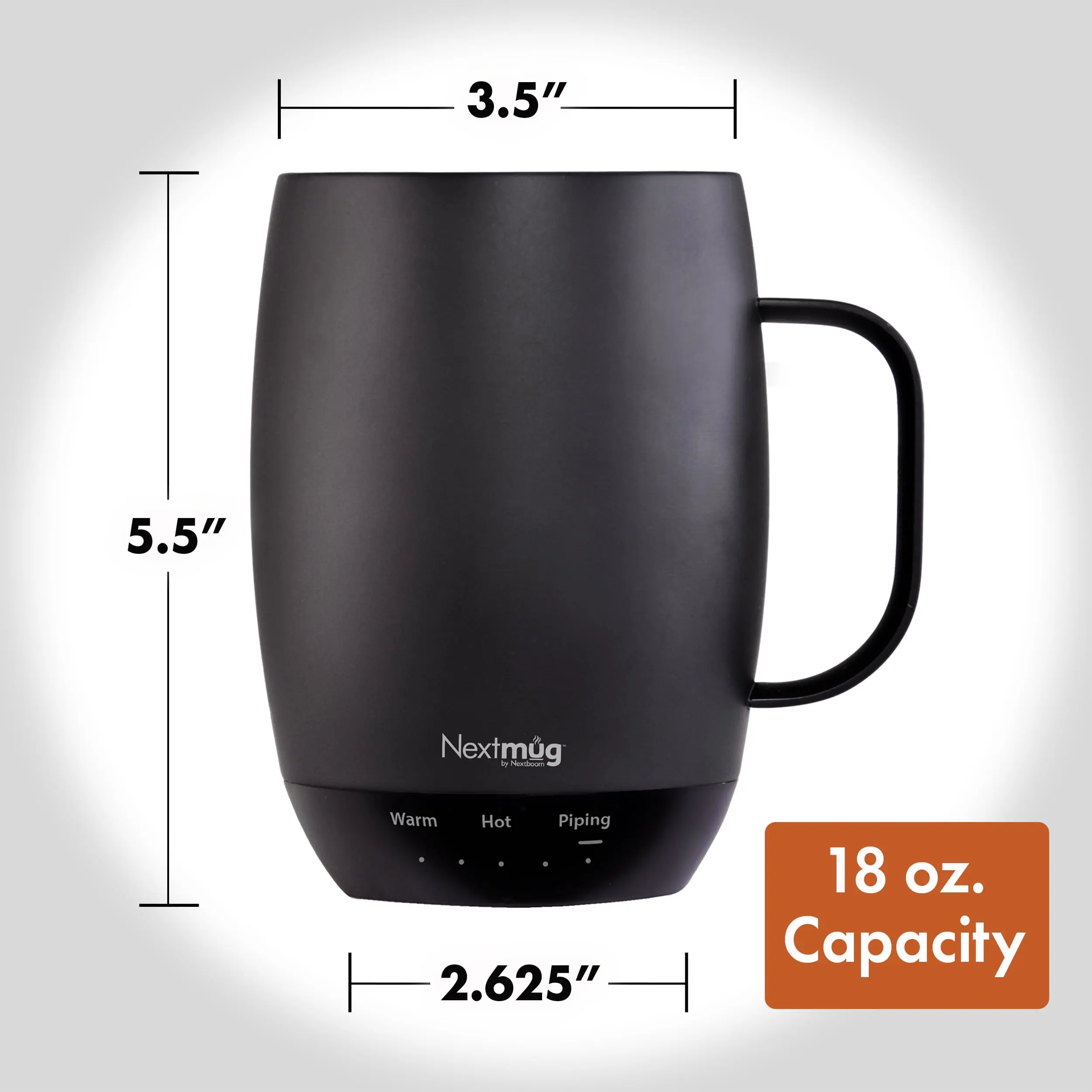 With 18 oz. of liquid capacity, the Nextmug Plus holds 29% more coffee or tea than the standard 14 ounce Nextmug. In addition, the Nextmug Plus features our longest-lasting battery.