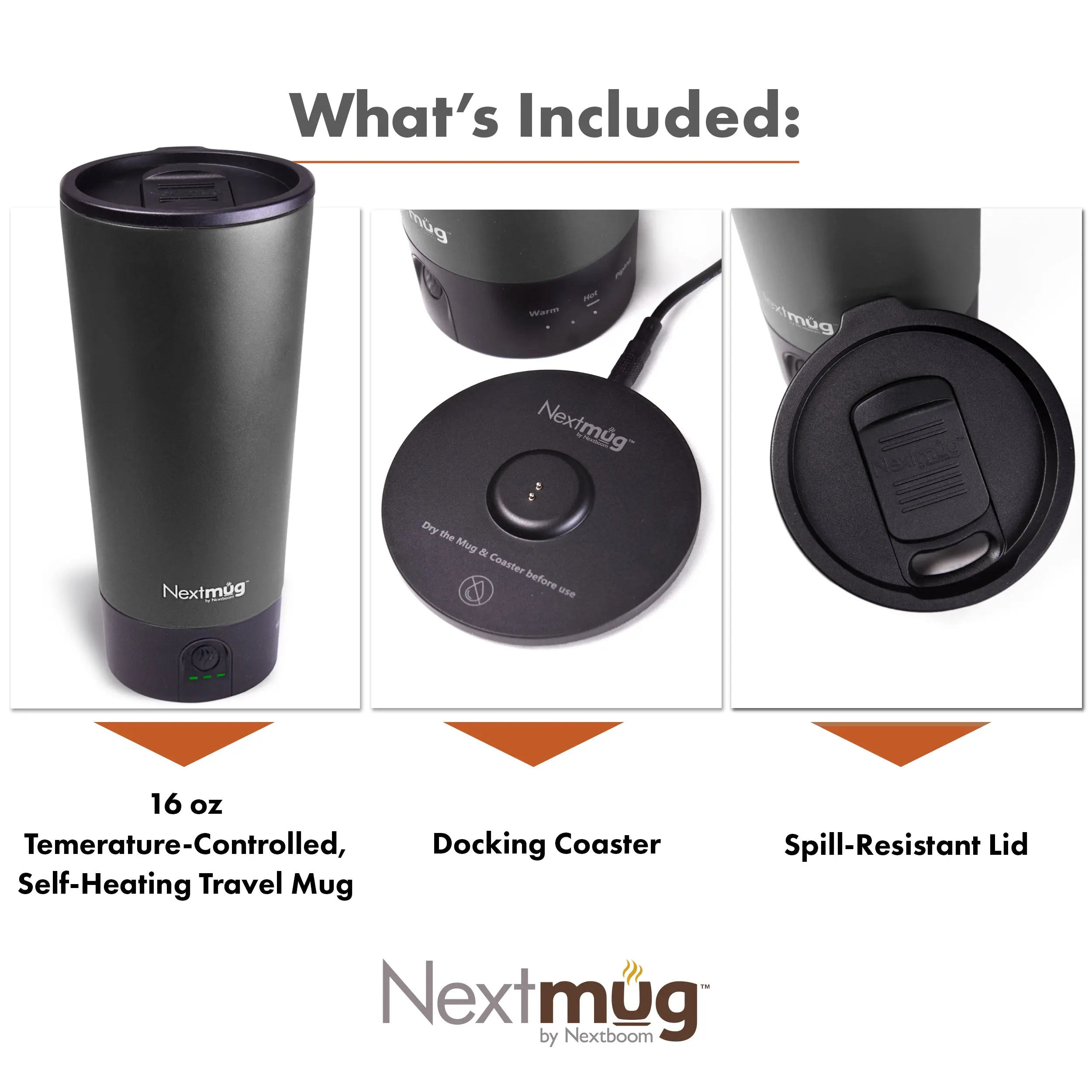 The Nextmug Go features our longest-lasting battery and LED lights display battery life & real-time temperature. Includes Spill-Resistant Go Lid & Charging Coaster.