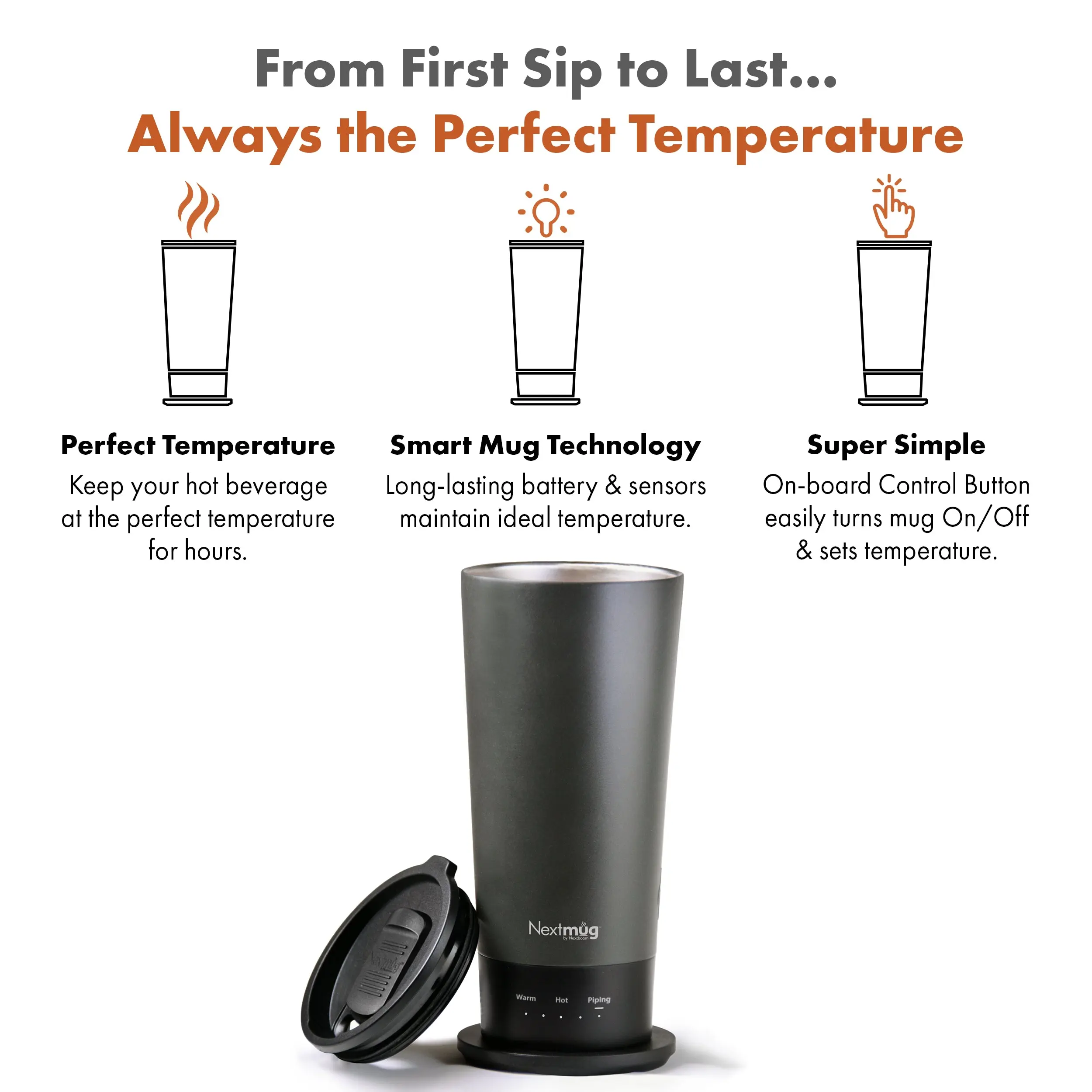 The Nextmug Go will keep your hot coffee, tea or preferred beverage at the perfect temperature wherever you are. Simply select Warm (130°), Hot (140°), or Piping (150°) and enjoy for hours.