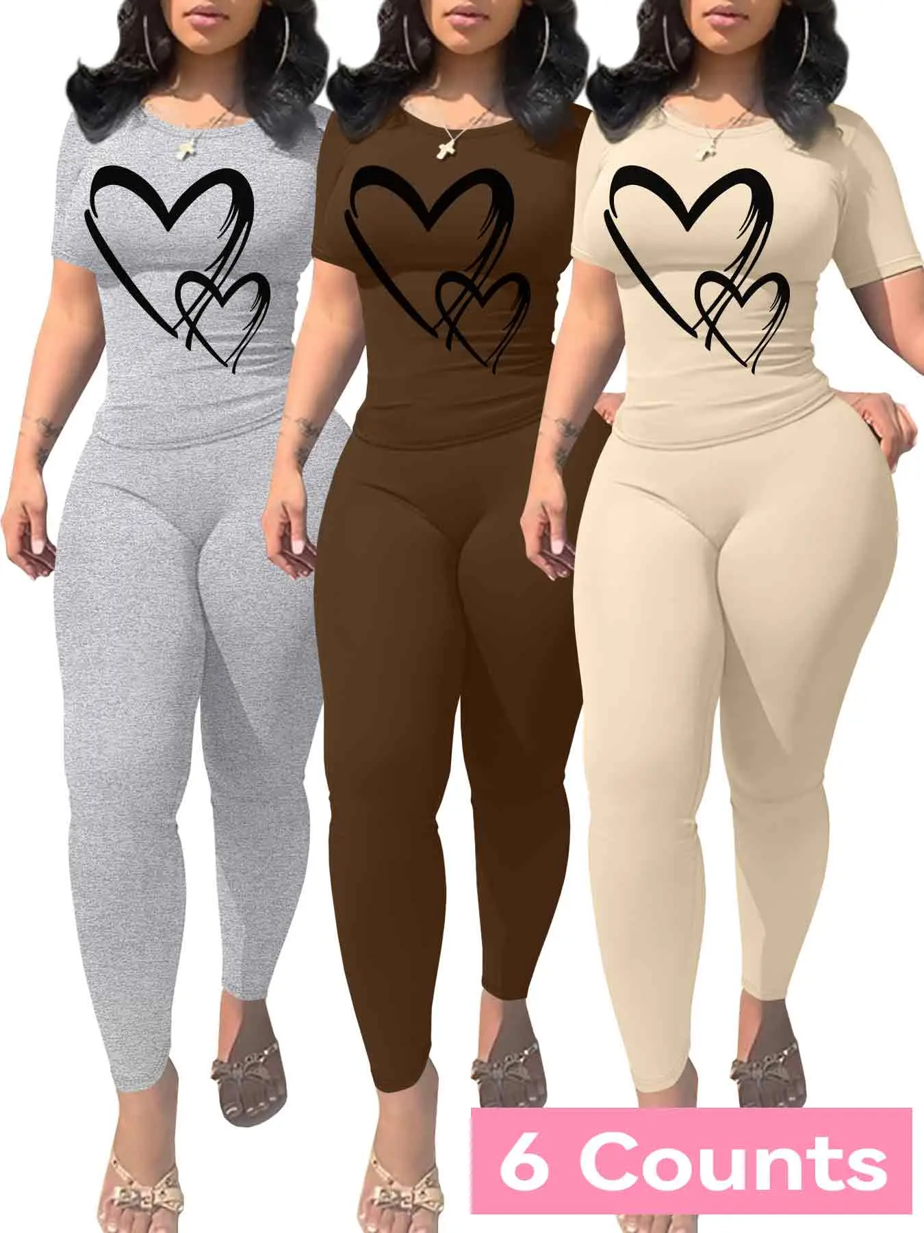 Women's Heart Print Crop Tee & Skinny Pants Set, Casual Short Sleeve T-shirt & Leggings, Ladies Summer Everyday Clothes for Daily Wear, Fit, Womenswear, Polish