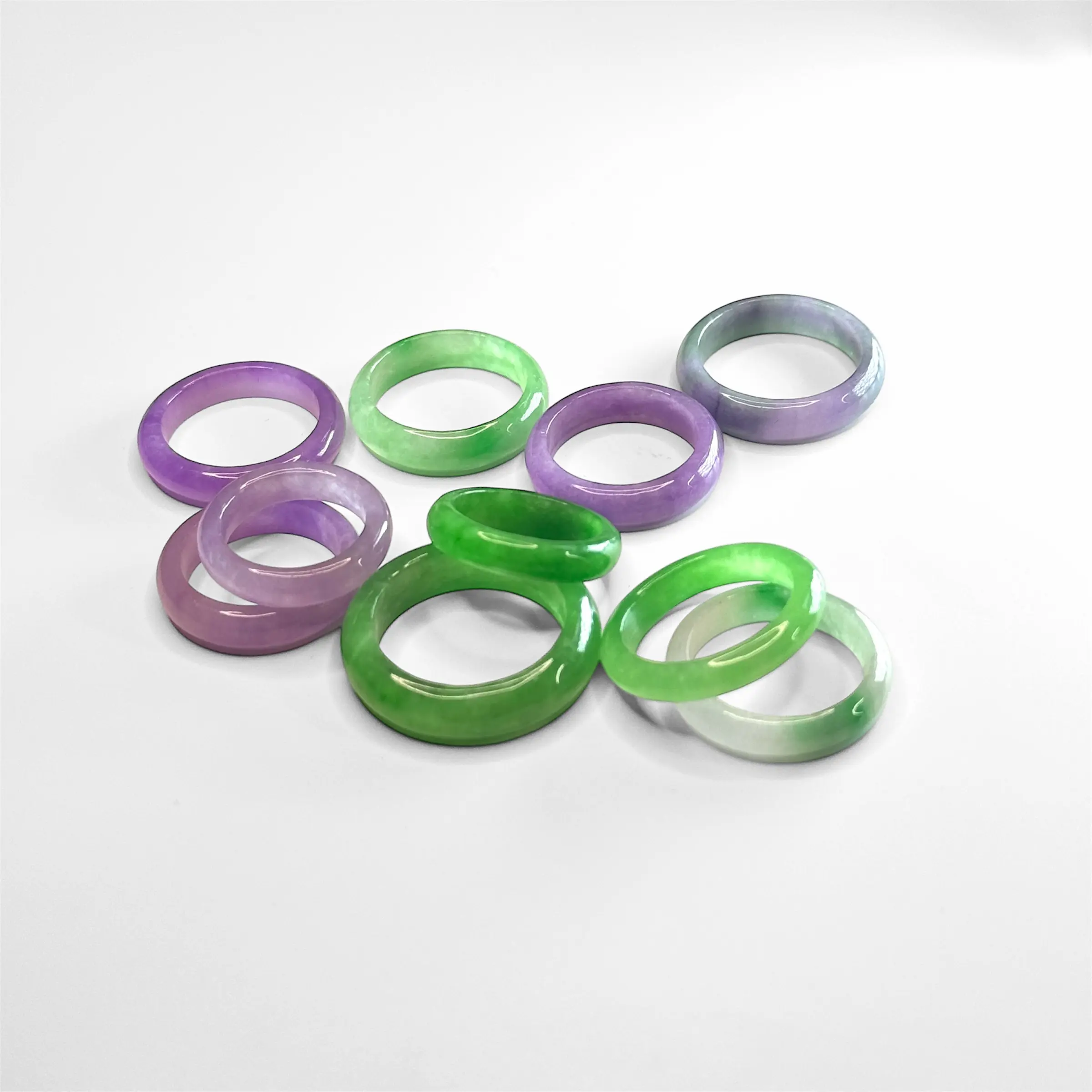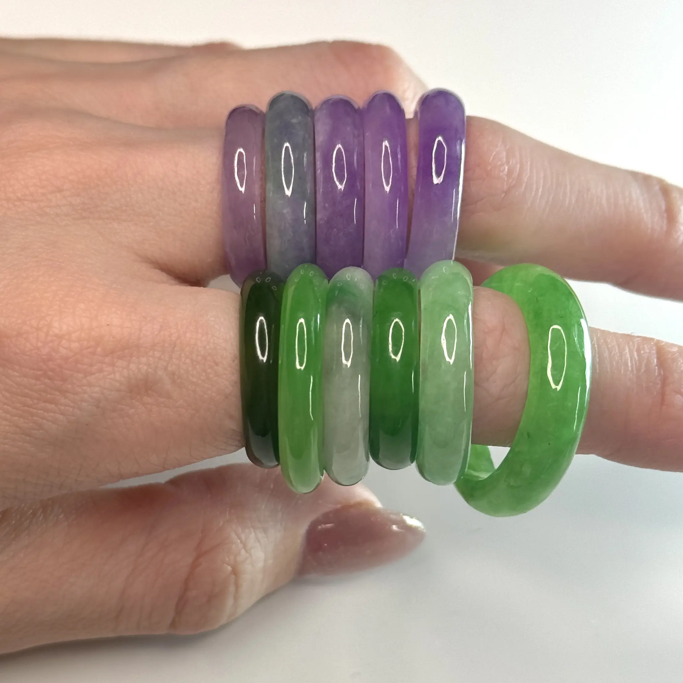 No two are alike. Each ring in this collection showcases its own natural tone — from soft lavender to vivid green. These hues form naturally over millions of years, giving each piece a completely one-of-a-kind identity.