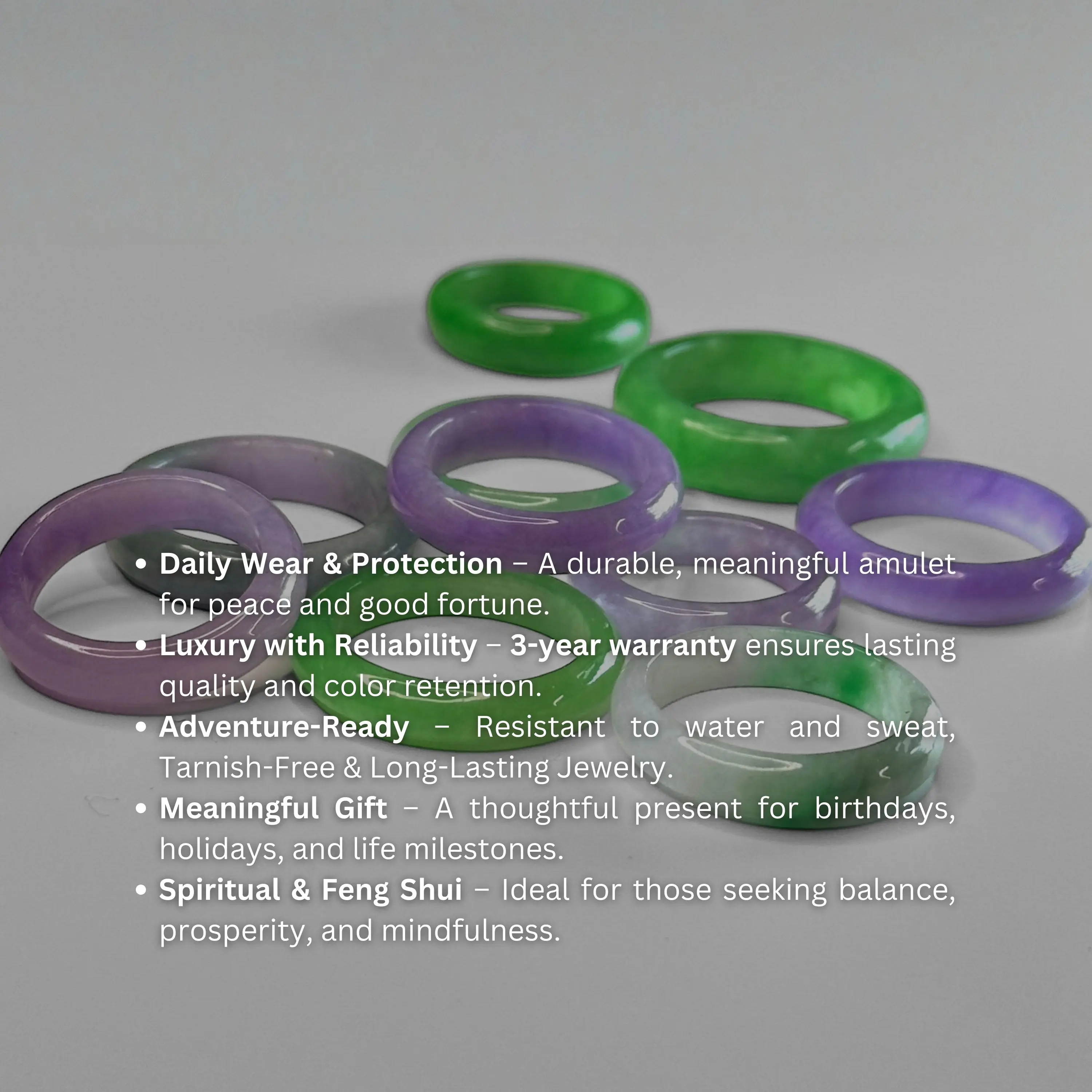 Every ring comes with our 3-year warranty, covering non-human damage such as cracking or discoloration. Each piece is certified authentic.