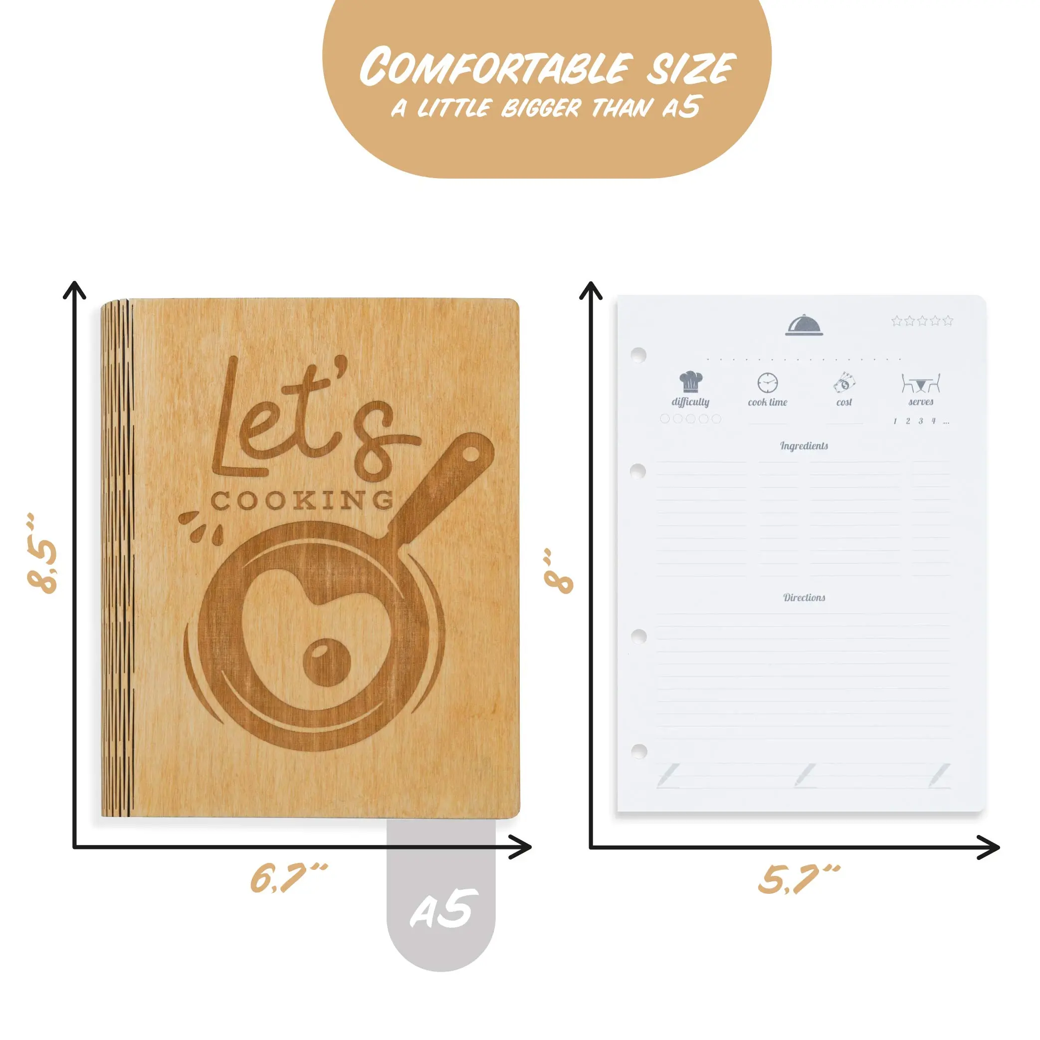 ·Eco notebook with plywood cover allows the recipe scrapbook to be collapsible and convinient for handwriting recipe cards. 4-Ring binder in hardcover cookbook prevent recipes from tearing and provide convenient page turning.
