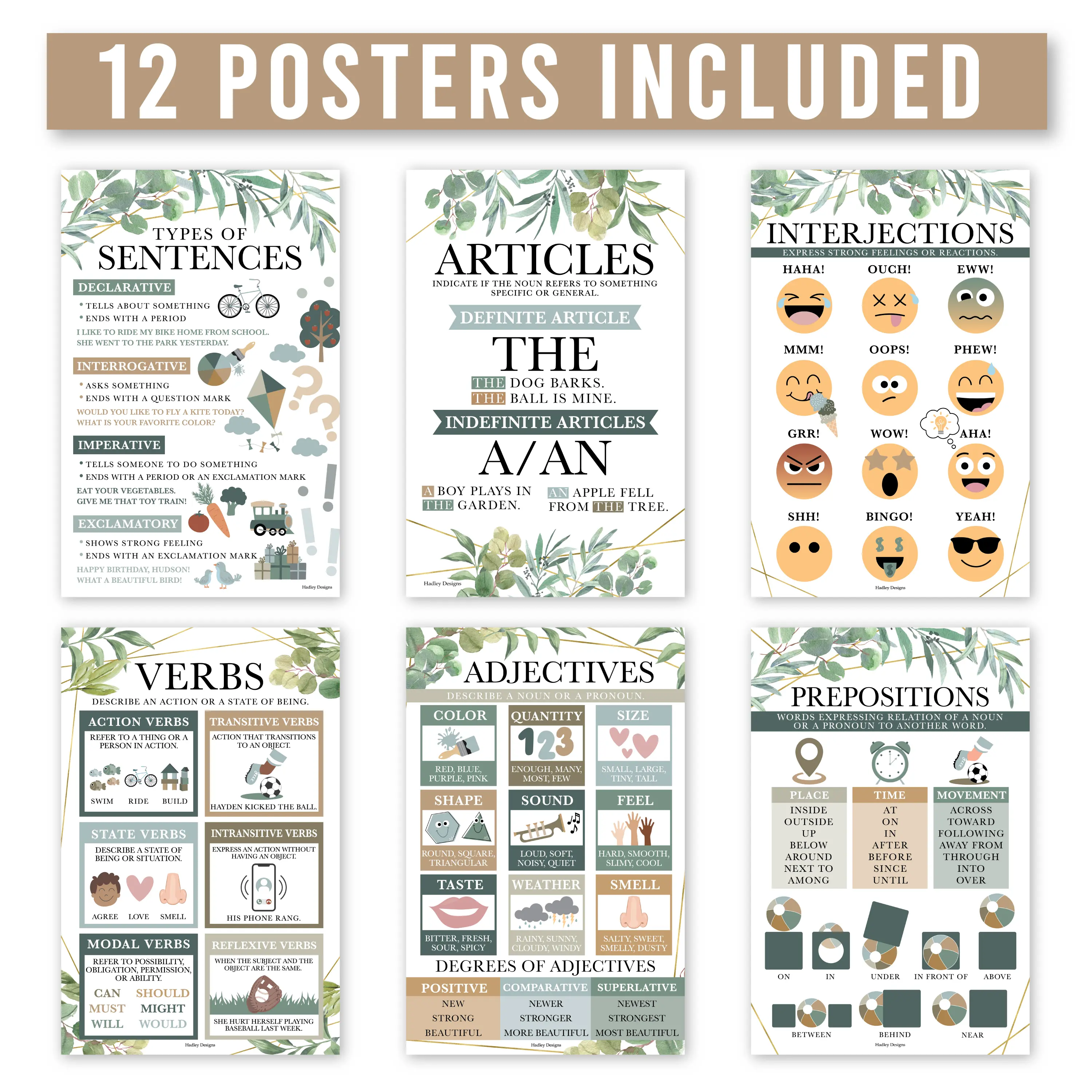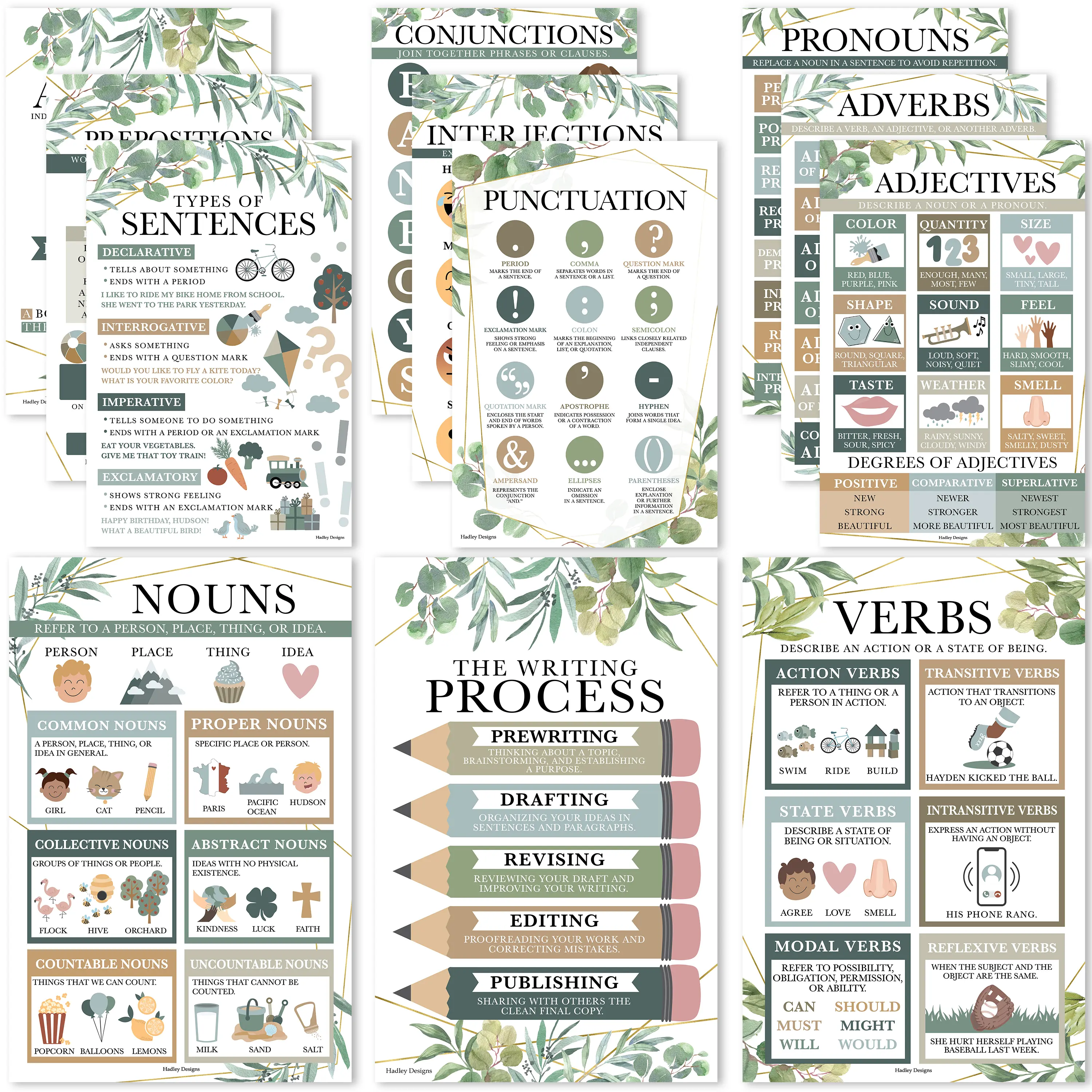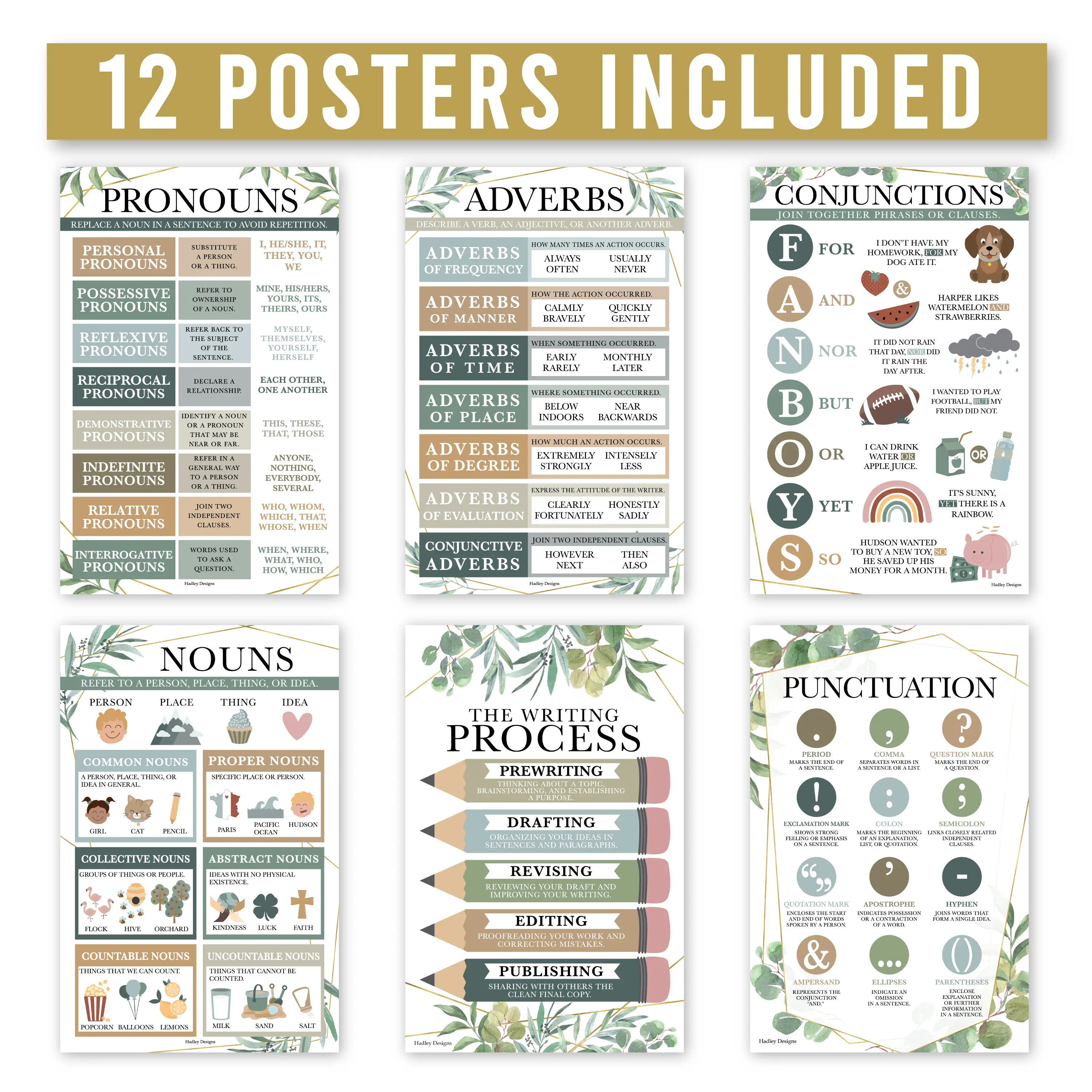 The English language is complex! Our English posters simplify confusing concepts while keeping kids engaged. Each set includes 12 posters, measuring 11x17 inches. Made with thick cardstock laminated for durability, these posters are long-lasting. Designed in the USA, they ensure clarity and ease of understanding. Perfect for 1st to 4th graders, these posters support future success. Contact us for any questions.