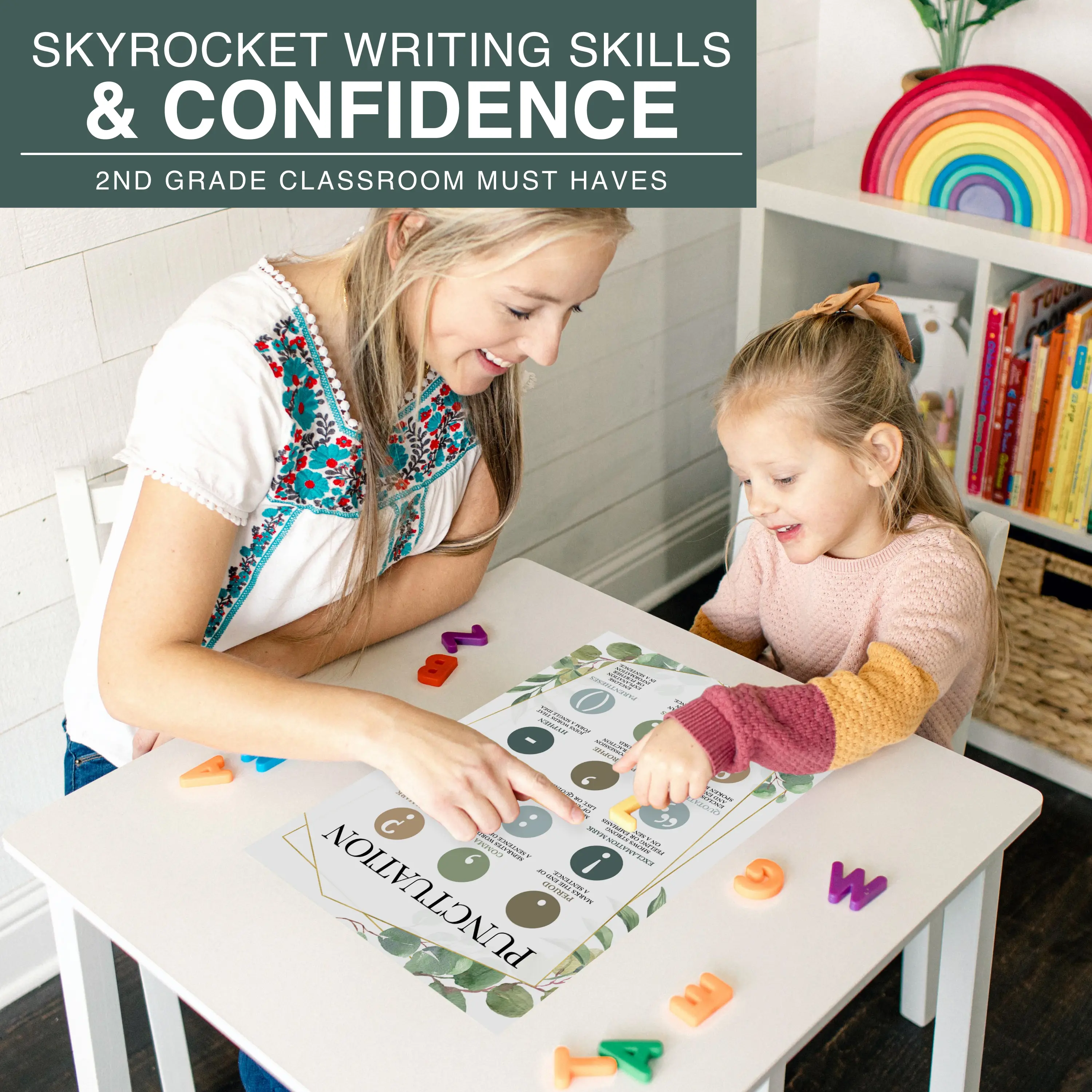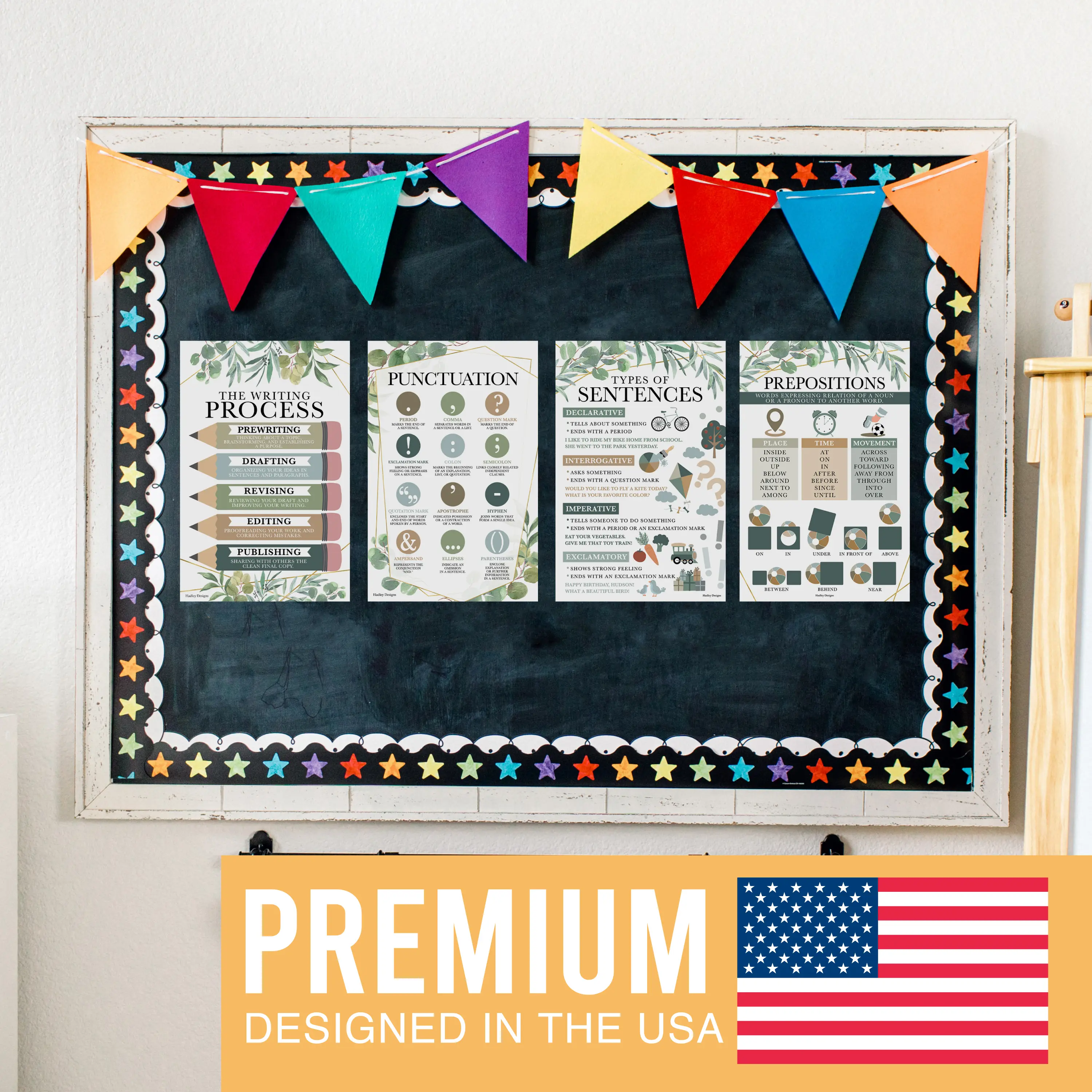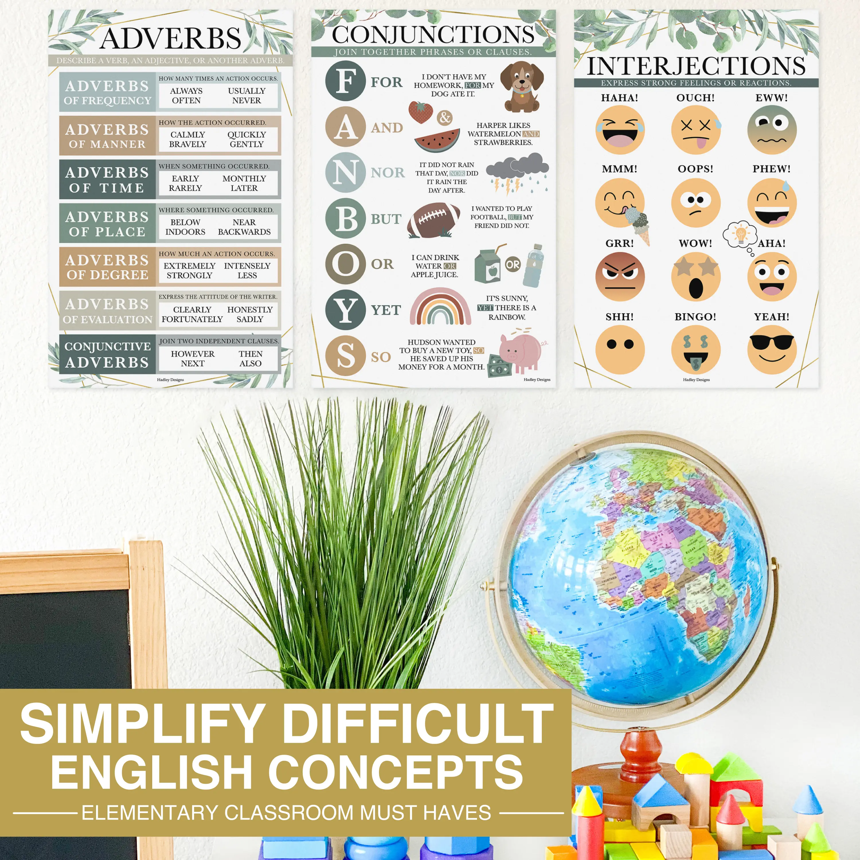 The English language is complex! Our English posters simplify confusing concepts while keeping kids engaged. Each set includes 12 posters, measuring 11x17 inches. Made with thick cardstock laminated for durability, these posters are long-lasting. Designed in the USA, they ensure clarity and ease of understanding. Perfect for 1st to 4th graders, these posters support future success. Contact us for any questions.