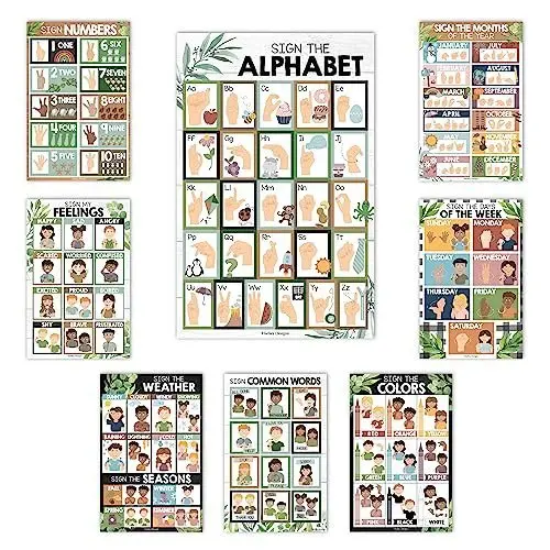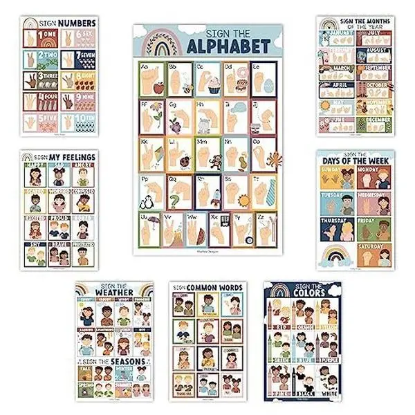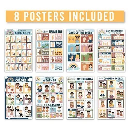 Unleash Your Students’ Language Abilities; You'll receive 8 different 11x17" laminated posters; so you can easily bridge communication gaps; Use as a sign language alphabet posters for classroom wall, asl emotions poster, sign language colors poster, or asl month and day poster signs