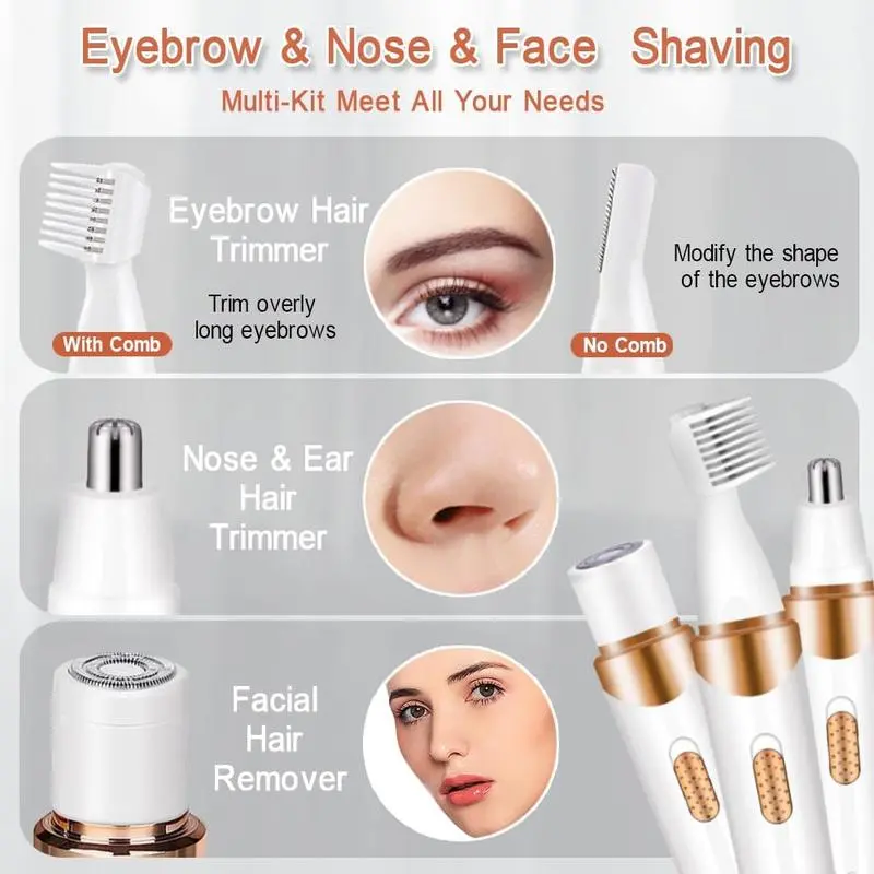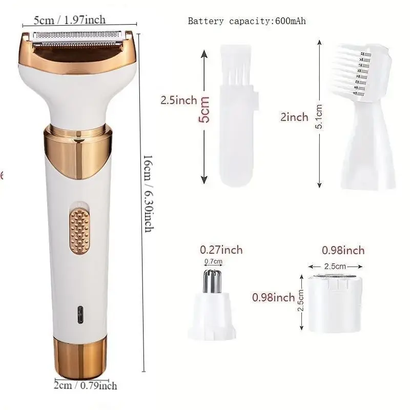 [4-in-1 Versatility]:Thismultifunctional electric shaveroffers 4-in-1 capabilities:it shaves, trims, epilates, andcan be used on various body parts.Cordless Convenience】:Enjoy the freedom of acordless hair trimmer that provides the flexibility to shaveand trim anywhere, powered by USB charging.