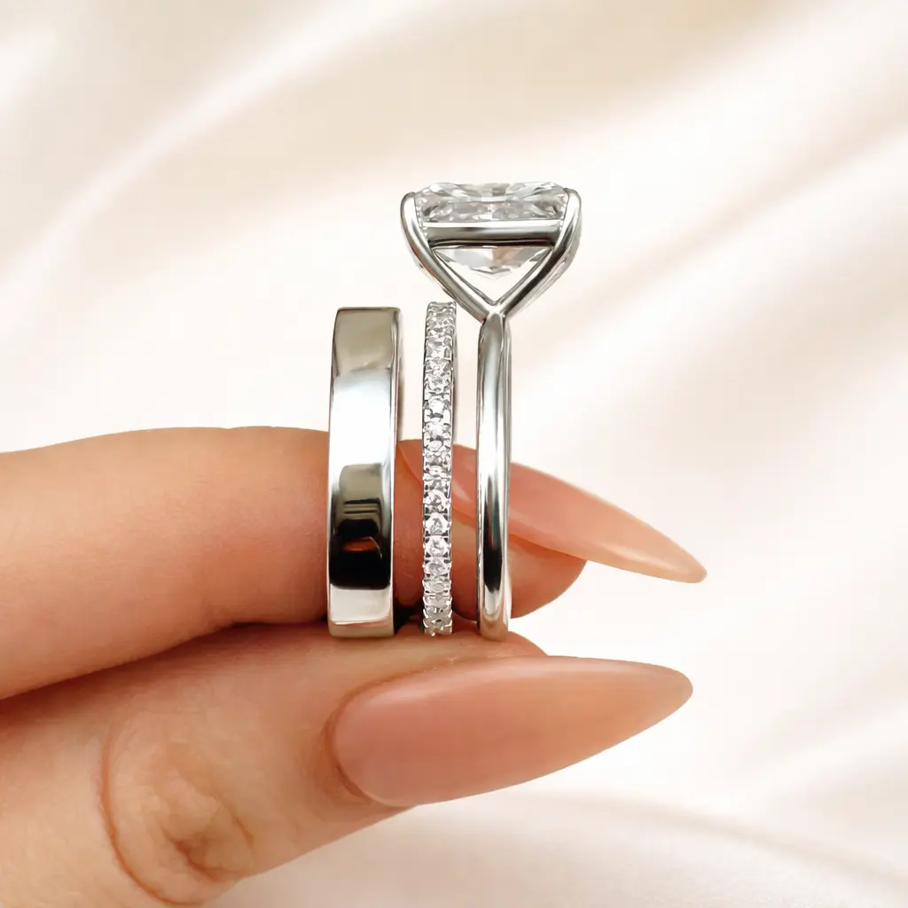 I'm pairing with a real sapphire and diamond band. The stones are very white and fiery. Band feels like it might not hold up to daily wear. Not sure if tarnishing or cloudiness will be an issue over time, but it exceeds my expectations for the money. Well presented with packaging. Good value.