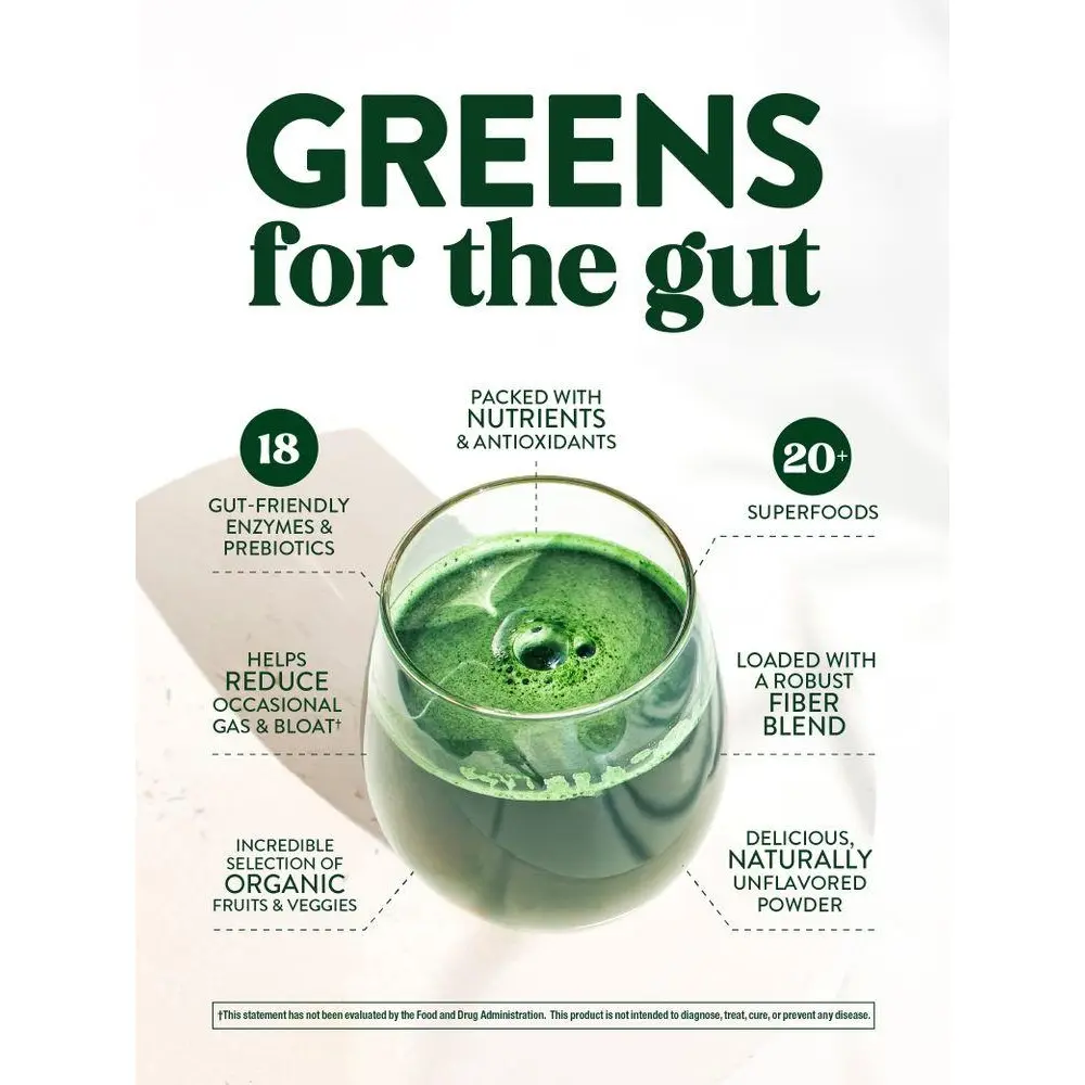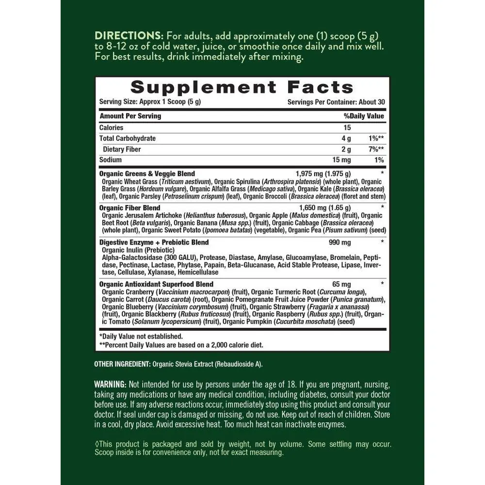 Nature’s Truth Organic Greens Powder packs over 20 organic superfoods, 18 digestive enzymes, and prebiotic support from organic inulin into every serving. This vegan formula is naturally unflavored with no added sugar. Enjoy your superfoods without the super effort! Simply add one scoop into 8-12 oz of cold water, juice, or your favorite beverage and mix well.