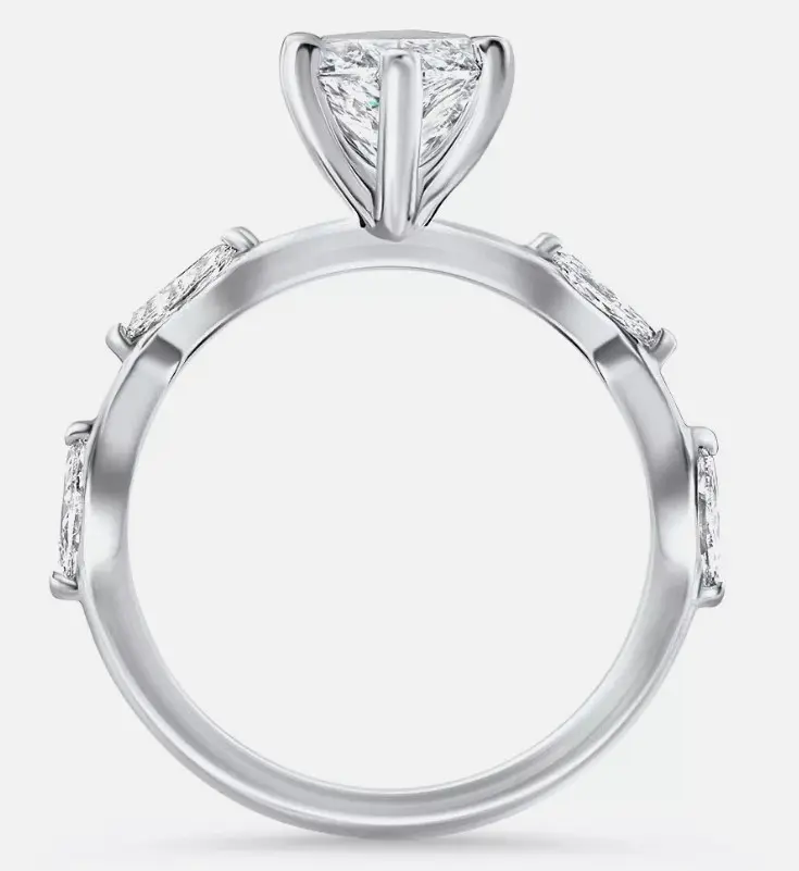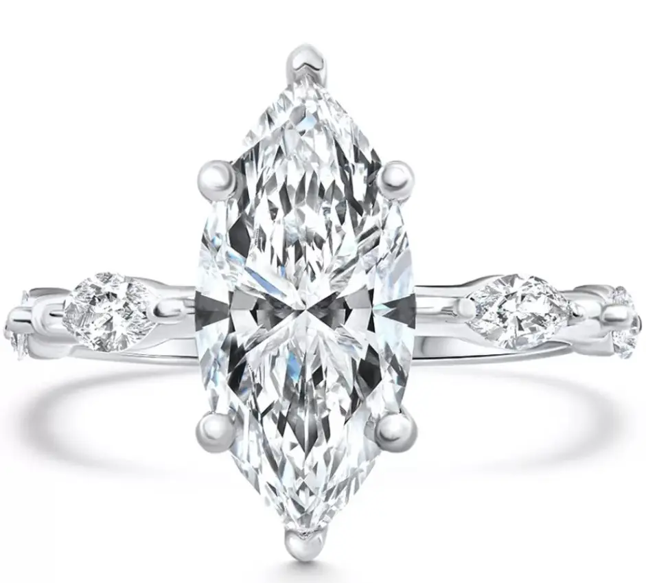 This classic and stunning women's engagement ring features a certified 3ct center diamond and four marquise cut accent diamonds. All stones are set in solid 14k white gold.