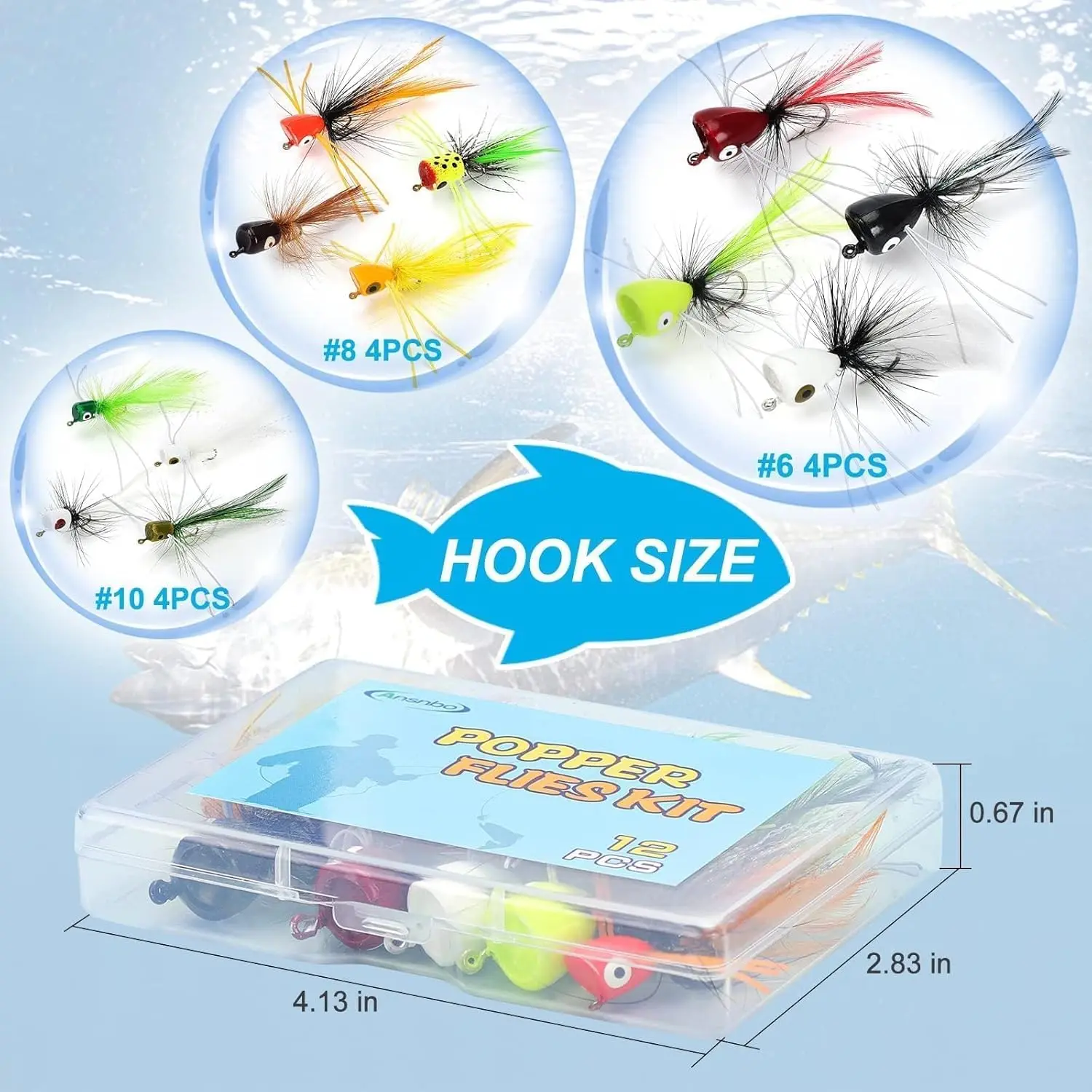 Total 12PCS fly fishing poppers with a fly storage box, Including 3 different size of fishing hooks and 4PCS popper flys for each size