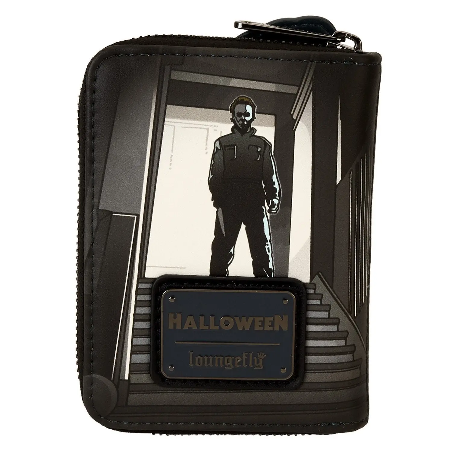 Your favorite haunts await. Stalk them in style with this Halloween zip-around wallet. The front features an eerie black-and-white scene of a moonlit night. An applique, in full color, provides a sharp contrast: A jack-o’-lantern with pointed edges and a hand that grips a knife, which edges down over the bottom of the backpack. Some details from this scene glow in the dark! Flip the wallet around, and Michael Myers makes an encore, standing at the top of a staircase. Secure your valuables for the day and chase whatever adventures lie ahead.