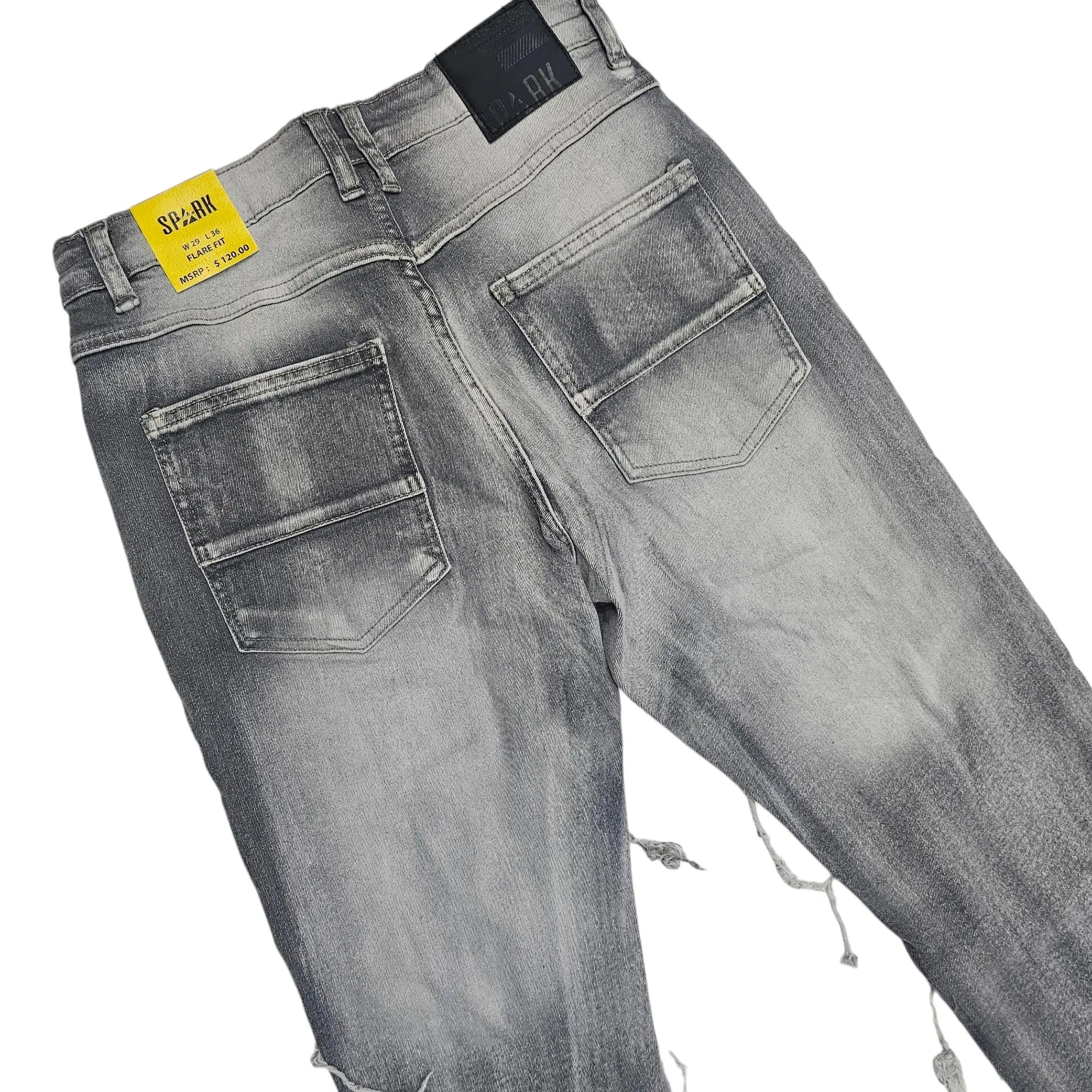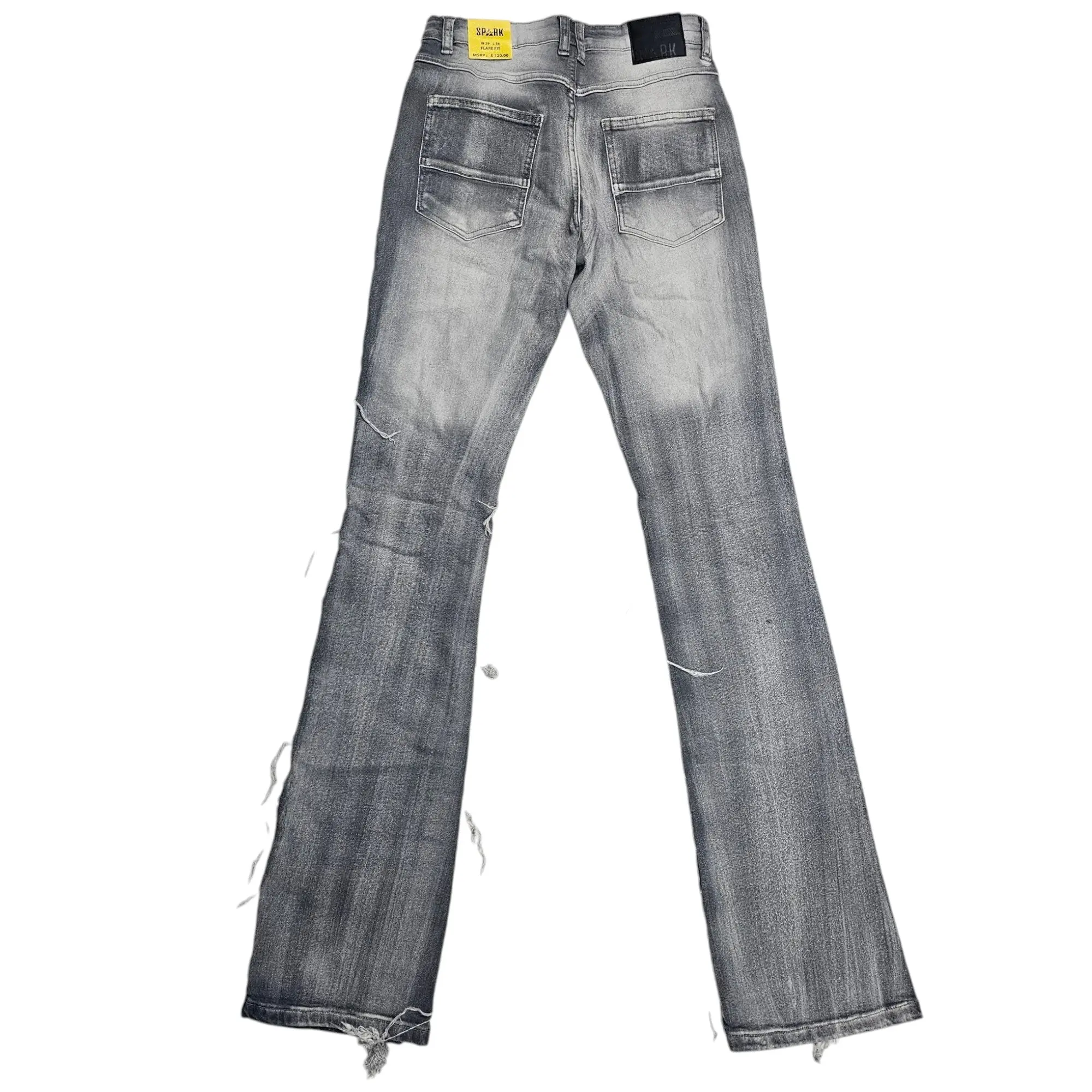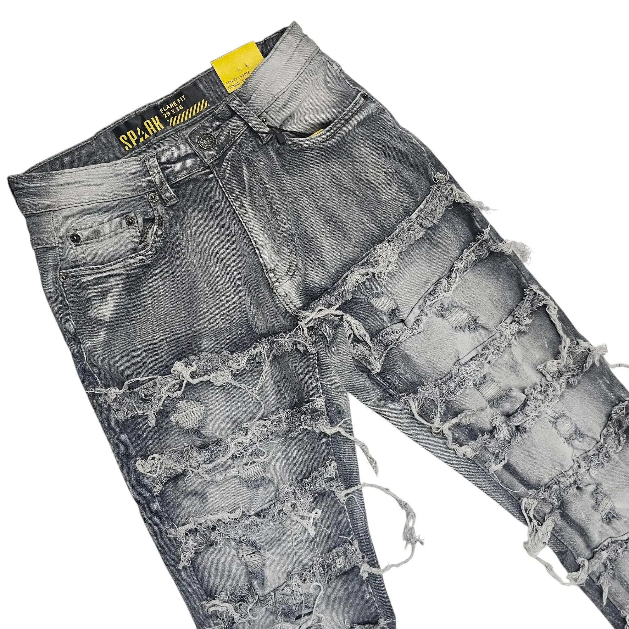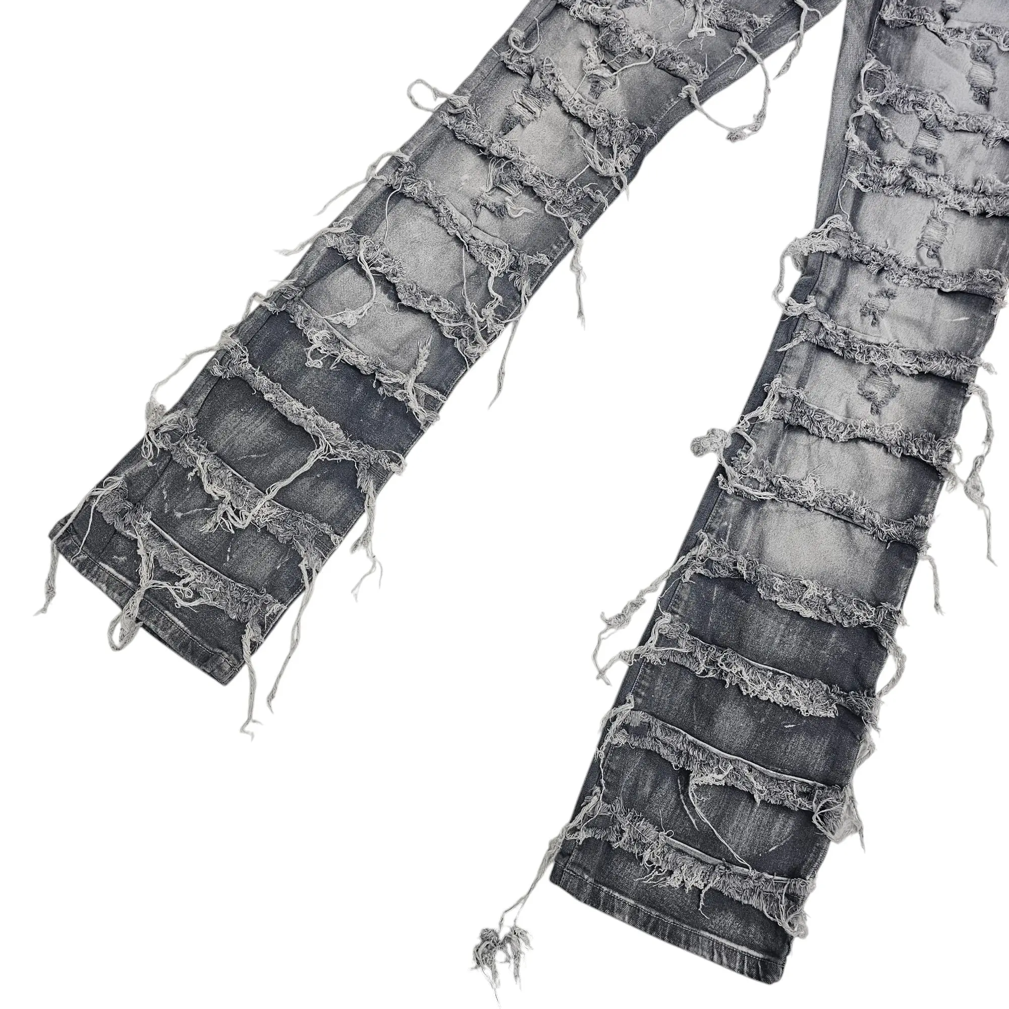 These are grey stacked jeans featuring horizontal paneling and frayed details throughout. The distressed style adds texture and visual interest. They have a 36-inch inseam, making them perfect for an edgy and elongated look.