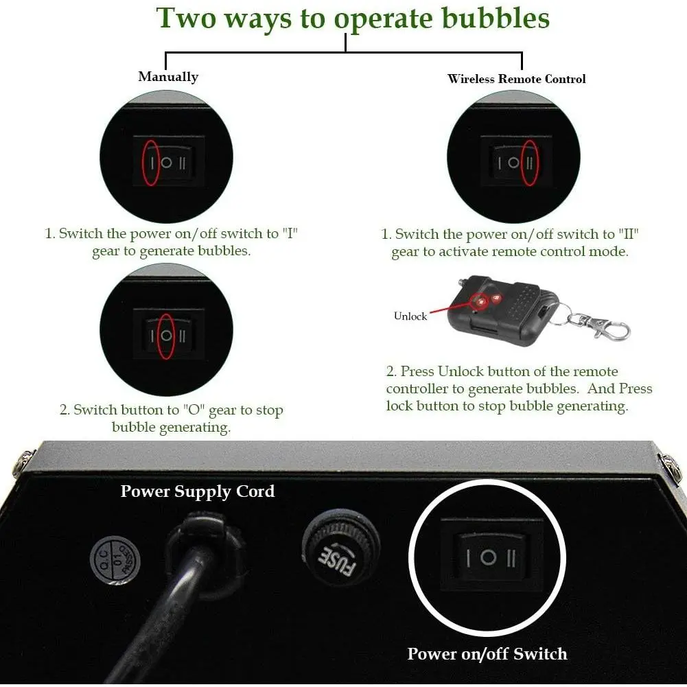 Wireless Remote Control: Switch the power on/off switch to "II" gear, Then the Remote control mode is activated.In this mode.Press Unlock button of the remote controller to generate bubbles.And Press lock button to stop bubble generating.