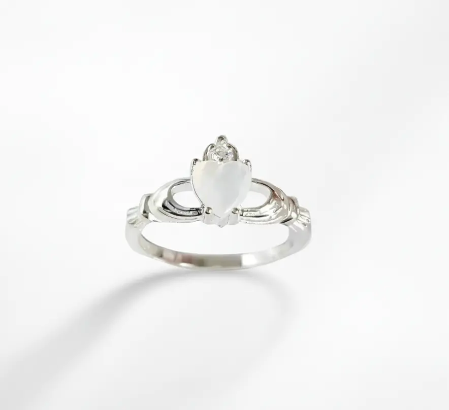 ·Design: Traditional Claddagh with Mother of Pearl and simulated diamond accent