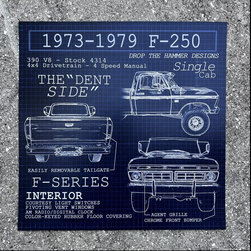 Introducing the Dentside 1970s Classic Pickup Truck Blueprint Poster, a must-have accessory for any old fomoco enthusiast looking for decoration. This 12x12 inch matte poster showcases the intricate blueprint making it an excellent addition to your automotive collection and/or office decor. Frame is not included. Poster has a matte, luxury grade finish.