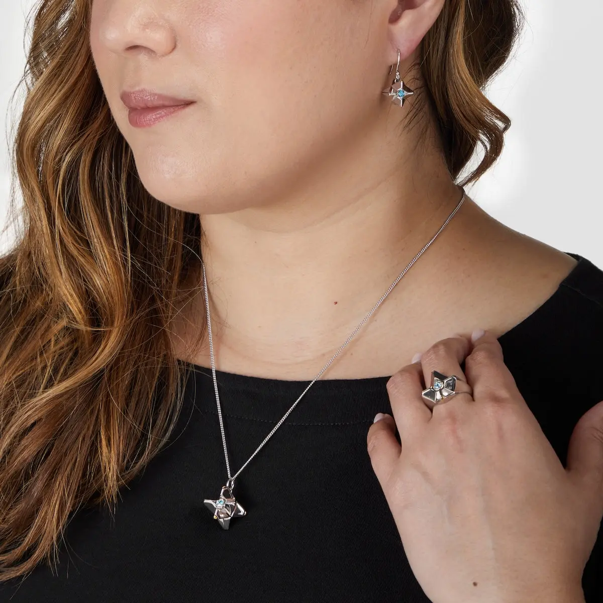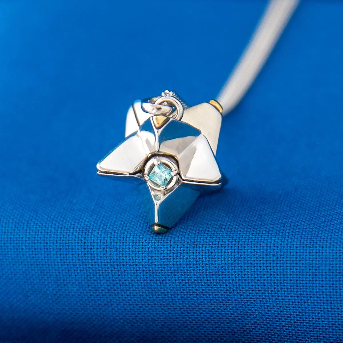 Handcrafted in nickel-free sterling silver, the iconic Generalist Shell Ghost Necklace is solid and weighty, with each polyhedron surface polished to a mirror shine. Capturing the charm of the in-game character, the entire back half of the Ghost rotates on its center axis! Fully three dimensional, the pendant features 14K yellow gold plated accents and a glittering faceted aqua blue cubic zirconia crystal core. The pendant hangs from an 18-20 inch adjustable sterling silver curb chain