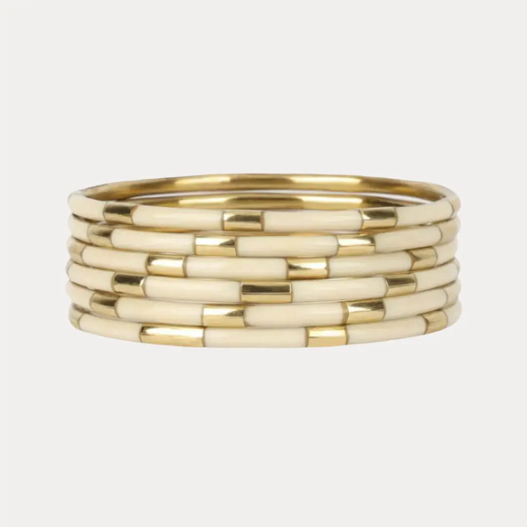BuDhaGirl's Veda enamel and brass bangles have become a beloved choice for mixing and matching! Every wardrobe needs wonderful, classic ivory. Vedas are meticulously crafted bangles that feature exquisite enamel work in stunning colors, designed to complement our AWB® and enhance your wristscape. With their slim profile and feather-light feel, these six beautiful bangles are a joy to wear because they are so very combinable