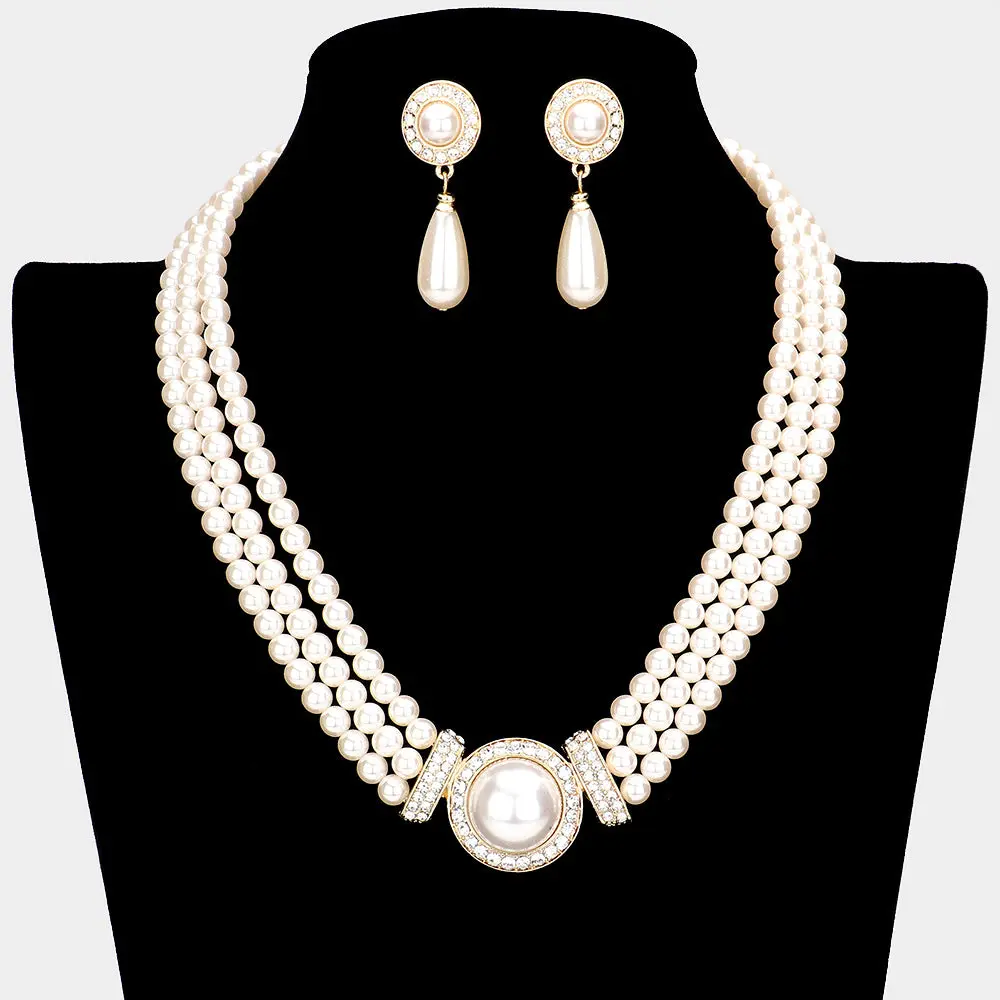 Three Row Cream Pearl Necklace with Cream Pearl Teardrop Earrings on Gold| Bridal Jewelry Sets