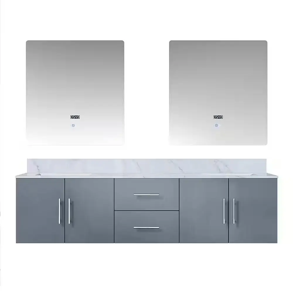 The Geneva 72-Inch Floating Dark Grey Bathroom Vanity with Double Undermount Ceramic Sinks and a luxurious White Carrara Marble Top is a modern combination of style and practicality. The floating wall-mounted design creates a sleek, space-saving aesthetic that works well in modern bathrooms. Dark grey finish gives it a refined and sophisticated touch, while the White Carrara marble top brings timeless beauty and exceptional durability.